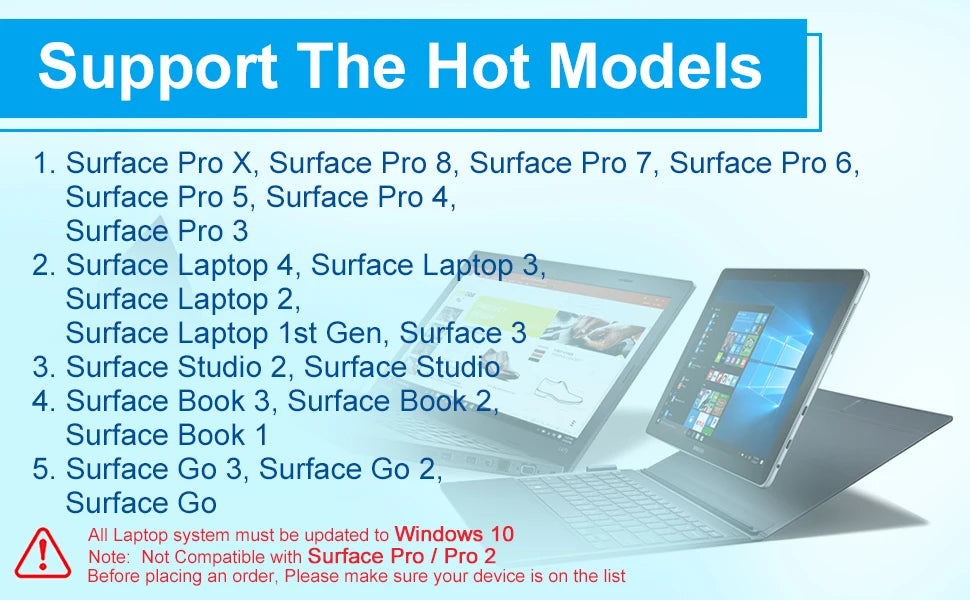 Surface Pro X,Surface Pro 9,Surface Pro 8, Surface Pro 7, Surface Pro 6 , Surface Pro 5 , Surface Pro 4, Surface Pro 3 , Surface Studio 2 , Surface Studio , Microsoft Surface , Surface Book 3 , Surface Book 2 , Surface Book , Surface Go 3 , Surface Go 2 , Surface Go , Surface Laptop 5 , Surface Laptop 4 , Surface Laptop 3 , Surface Laptop 2 , Surface Laptop.