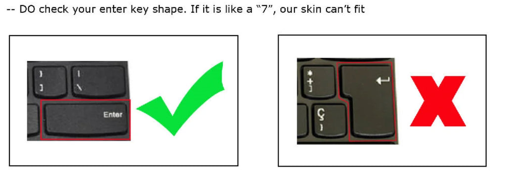 2, DO check your "enter" key to make sure it is a rectangle as the photo's. If your "enter" key looks like "7", our skin can't fit.