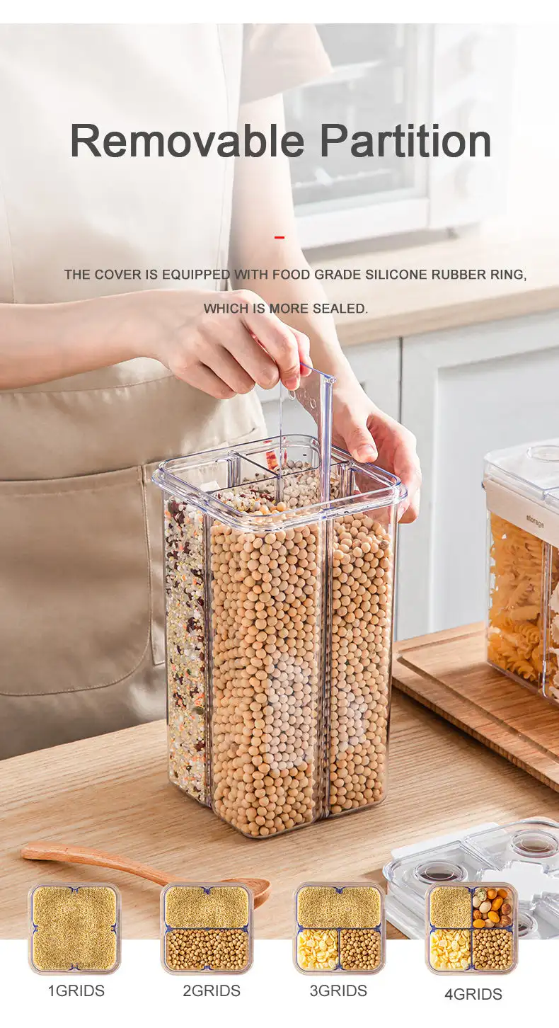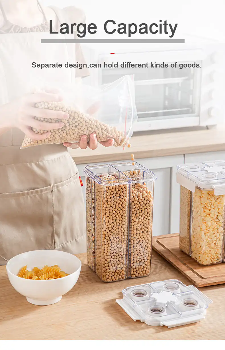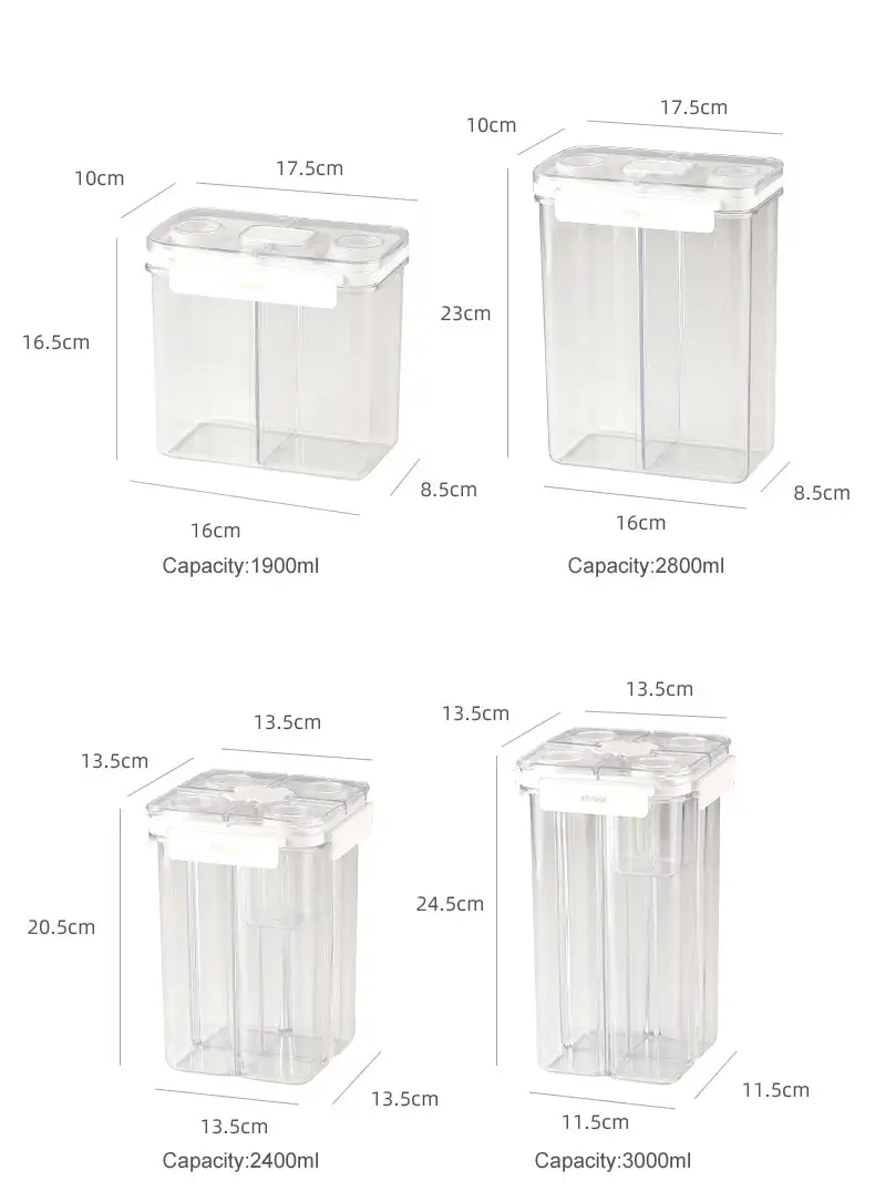 This partitioned food storage container is made of high-quality PET Material, offering excellent transparency and durability. Its partitioned design is ideal for storing different types of food separately, effectively preventing cross-flavoring. With superior sealing performance, it keeps food fresh and maintains its original flavor. Available in multiple sizes and capacities to meet various needs in the kitchen. Whether storing nuts, snacks, or grains, this container provides a convenient storage solution for your kitchen.