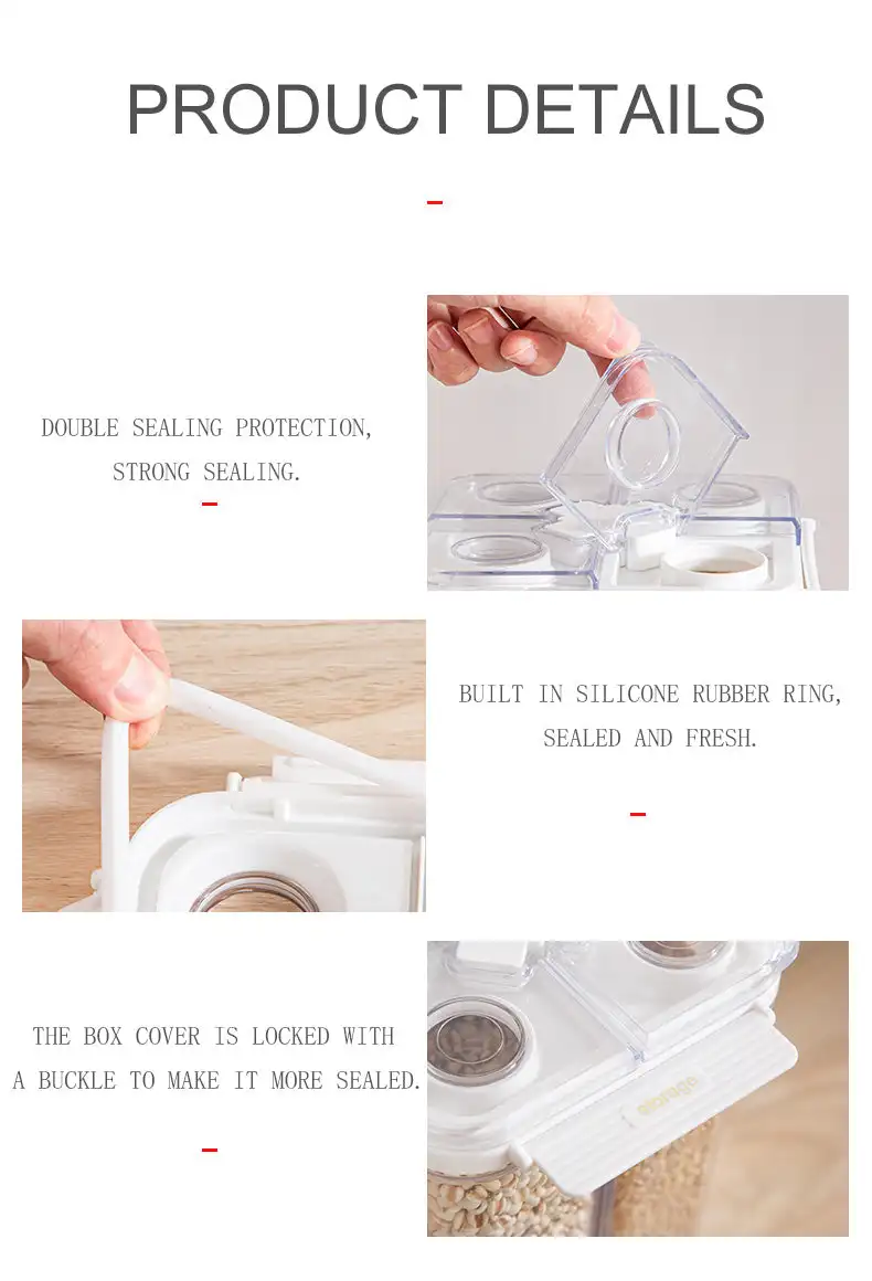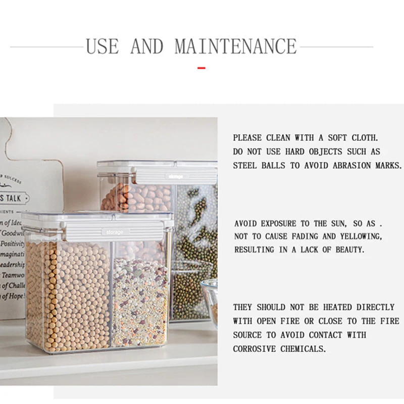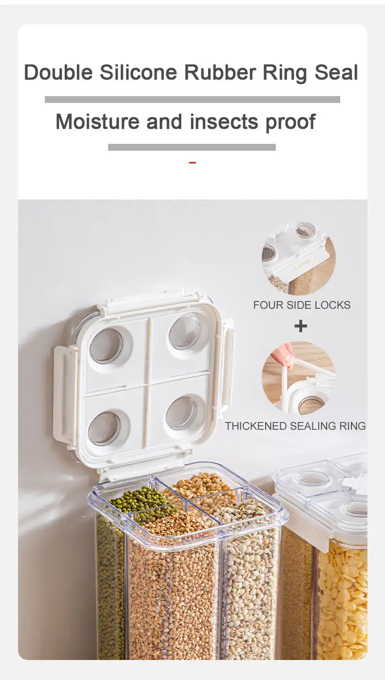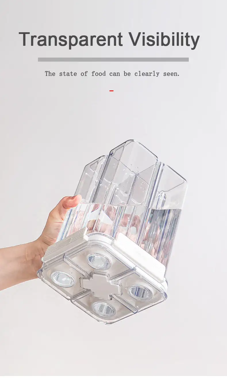 This partitioned food storage container is made of high-quality PET Material, offering excellent transparency and durability. Its partitioned design is ideal for storing different types of food separately, effectively preventing cross-flavoring. With superior sealing performance, it keeps food fresh and maintains its original flavor. Available in multiple sizes and capacities to meet various needs in the kitchen. Whether storing nuts, snacks, or grains, this container provides a convenient storage solution for your kitchen.