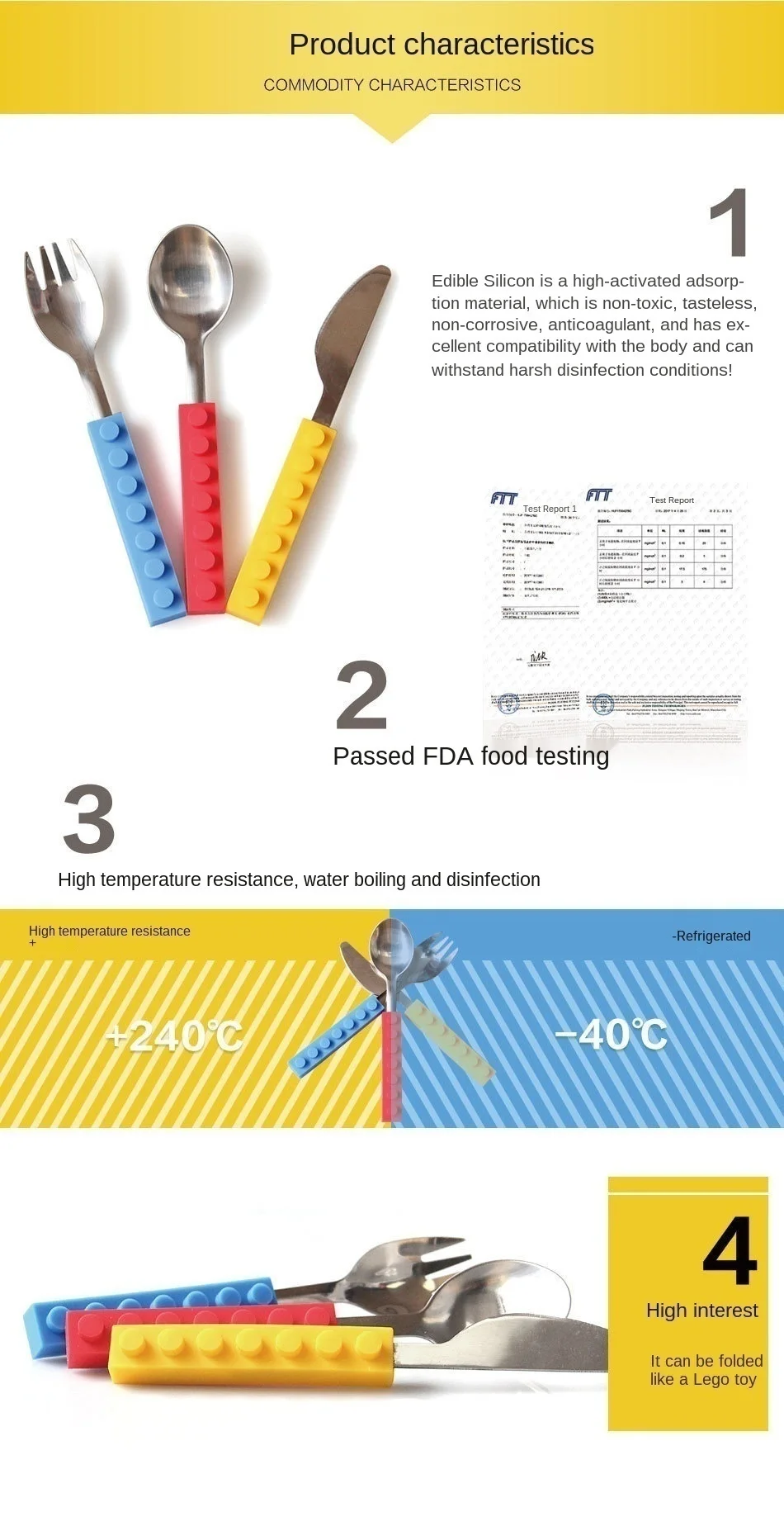 3pcs Stainless Dinnerware Children Western Cutlery Set Knife Fork Spoon Steel Dinner Tableware Silicone Building Blocks Handle