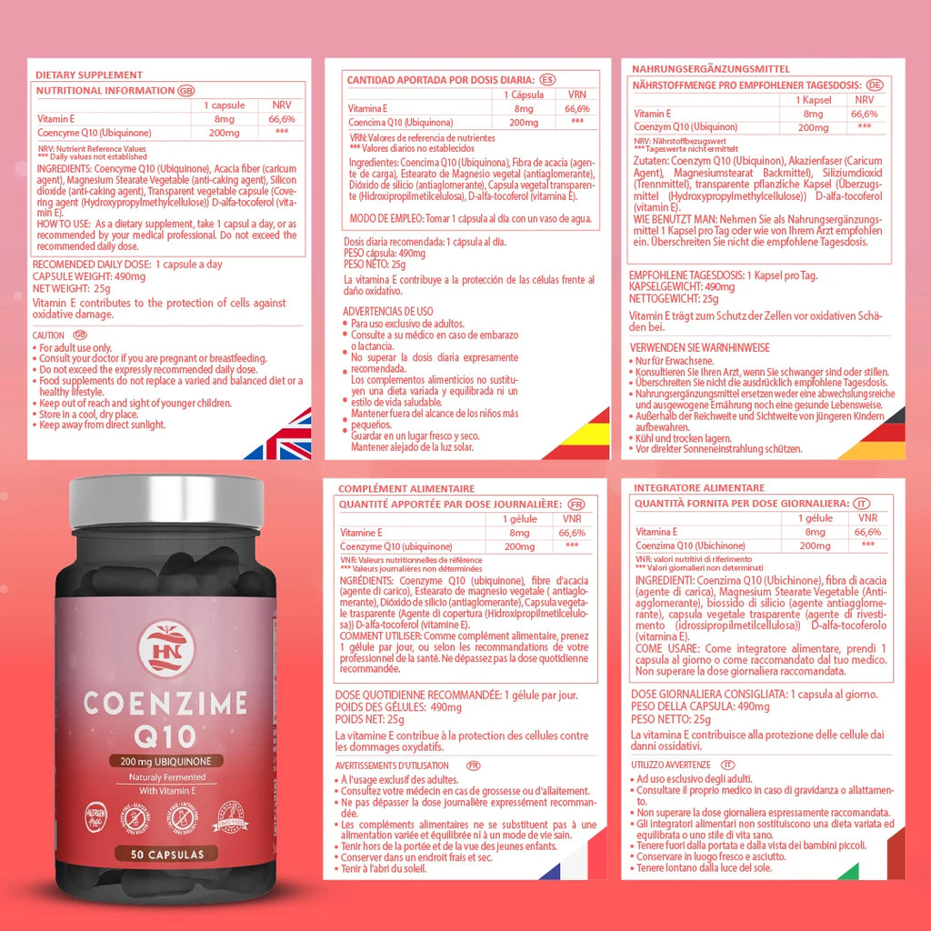 energy Cellular And Vitality: Q Enzyme Q10 Or Ubiquinol 200mg Is A Component Essential For The Production Of Energy Cellular And Increase The Production Of Atp, Essential For The Energy Daily. Ideal For Who Are looking for A Impulse Natural Obtaining Multiple Benefits For The Health, The Heart And The Muscles. support Cardiovascular And Reduction Of Pressure: the Co Q10 Is Crucial For The Heart, A Organ With Tall Demands Of Energy. The Cq10 Improvement The Efficiency Energy Of The Cells Cardiac And Can Help A Reduce The Pressure Arterial. benefits For The Brain And The Nerves: The Formula Of Coenzyme Q10 With Vitamin E Acts As A Powerful Antioxidant Reducing The Damage Oxidative In The Cells. This Is Vital For Prevent The Aging Cellular And Diseases Related With The Stress Oxidative. recovery Muscle And Performance: The Coenzyme Q10 200 Mg Is Perfect For Athletes Improving The Energy, The Resistance Physics And The Recovery Of The Muscles By The That You can Train More Strong And Recover More Fast. multiple Benefits: The Coenzyme Q10 To the Be A Antioxidant, Can Help A Protect The Skin Against The Damage Oxidative And Reduce The Figs Of the Aging, Reducing Wrinkles. I also Can Improve The Sensitivity A The Insulin And Help A Control The Levels Of Glucose In Blood. free Of Allergens: Our Supplement Of 200mg Of Co Q10 Comes In Capsules Easy Of Swallow, Suitable For Vegans, No Contain Gmo (organisms Modified Genetically) And No Contain Allergens As Gluten, Soy And Lactose.