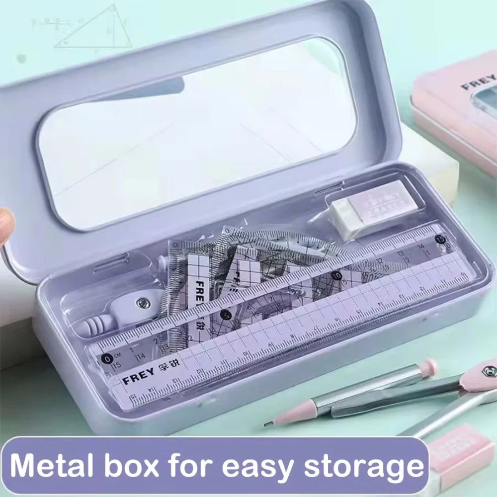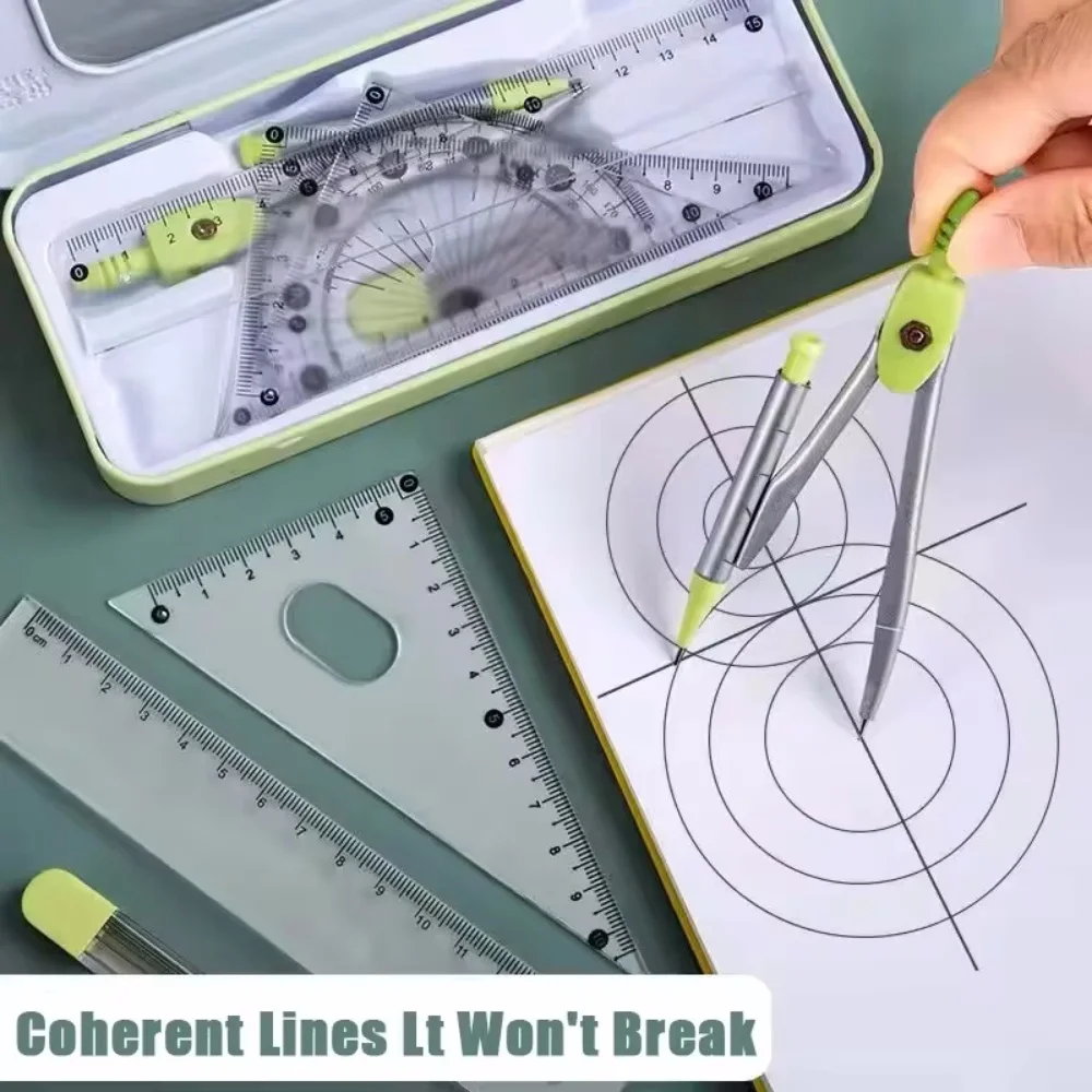 Composition: ruler*1. Triangle ruler*2. Protractor*1. Eraser*1. Lead core*1. Drawing compass*1.