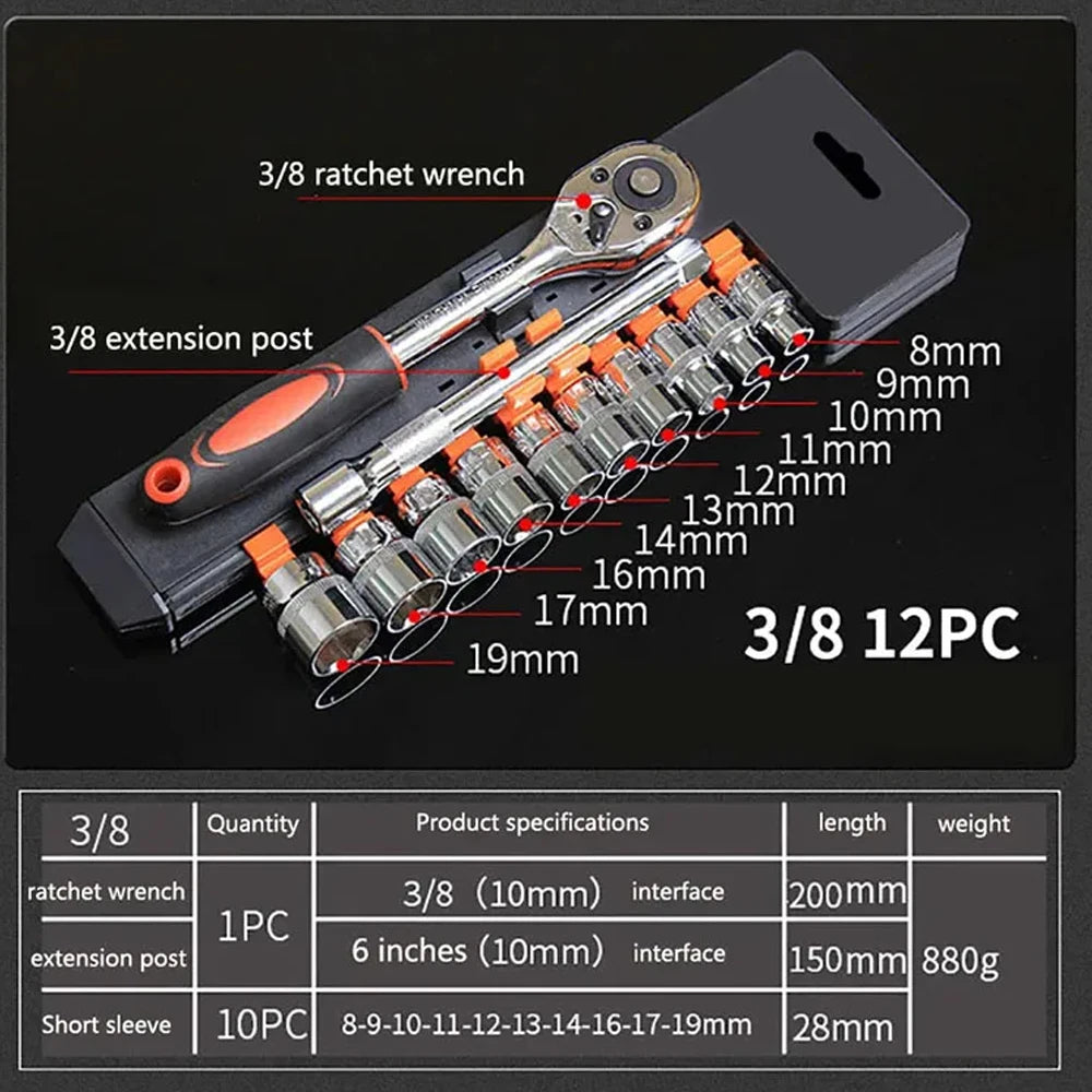 3/8 ": 8mm, 9mm, 10mm, 11mm, 12mm, 13mm, 14mm, 16mm, 17mm, 19mm