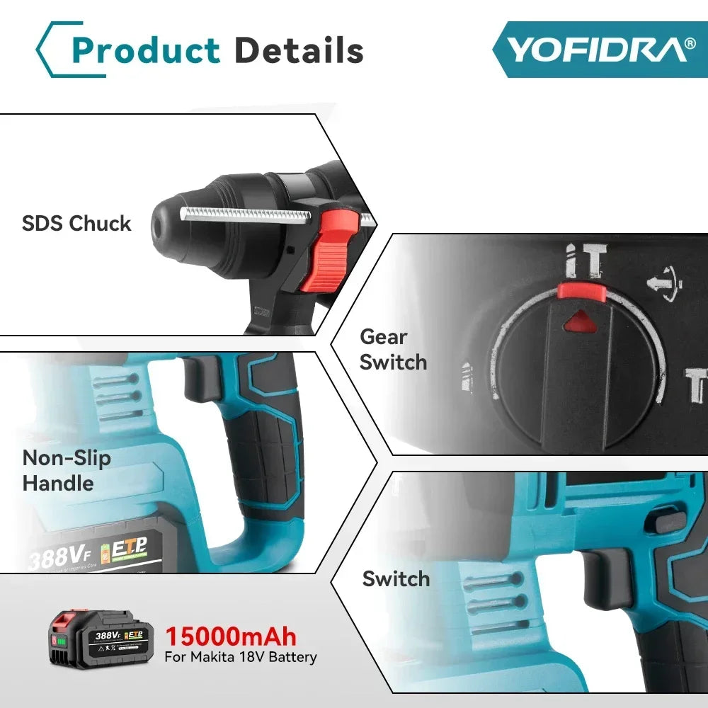 Yofidra Brushless Electric Hammer 4 Function Multifunctional Cordless Rechargeable Screwdriver Power Tool For Makita 18V Battery