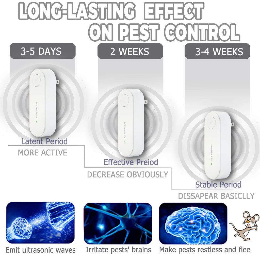 Easy to install and work - Place our ultrasonic repellent 31.5-47.5 inches from the ground, simply plug in our electronic pest control and it will do the rest when lighting 3 colored lights. Usually you can see the effect within 3-4 weeks, depending on the degree of infestation.Make sure that the repeller is not obstructed by furniture or electrical appliances when in use.