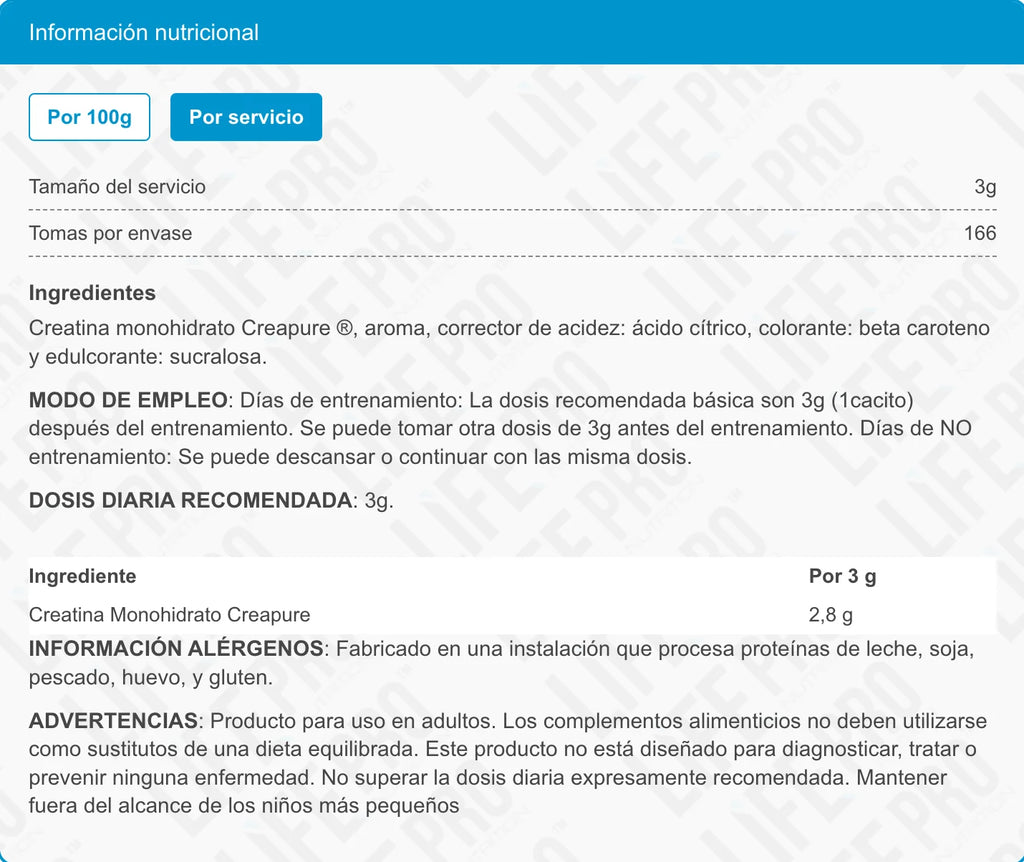 Nutritional Information: For 3 g (1 Serving): Creatine Monohydrate: 3,000 Mg