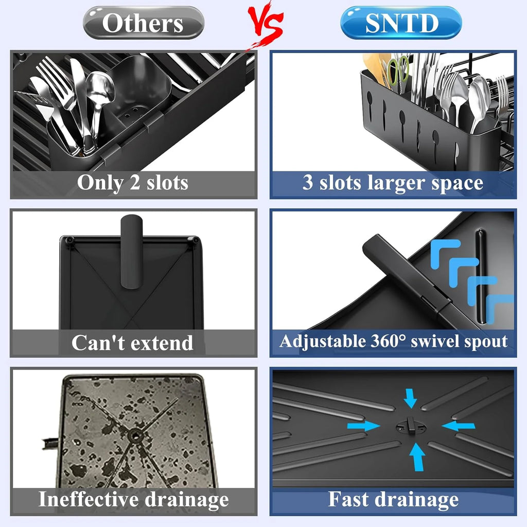EFFICIENT DRAINAGE: Consist of upgraded draining spout, adjustable swivel drain and angled drainboard,SNTD dish dryer rack perfectly avoids water leakage and drains effectly. (Note: Make sure your kitchen sink is flush with the counter for better fitting the height of drainboard.)