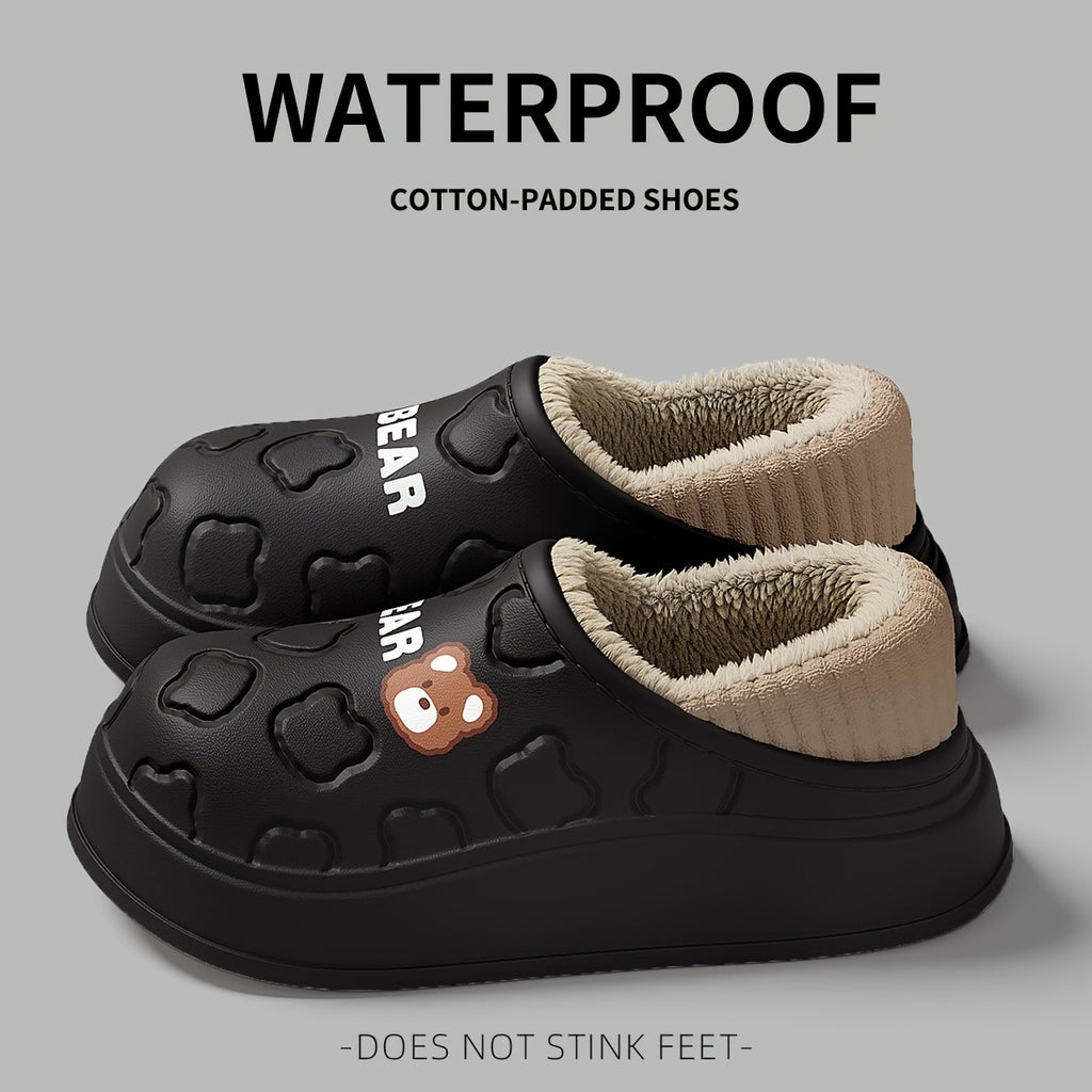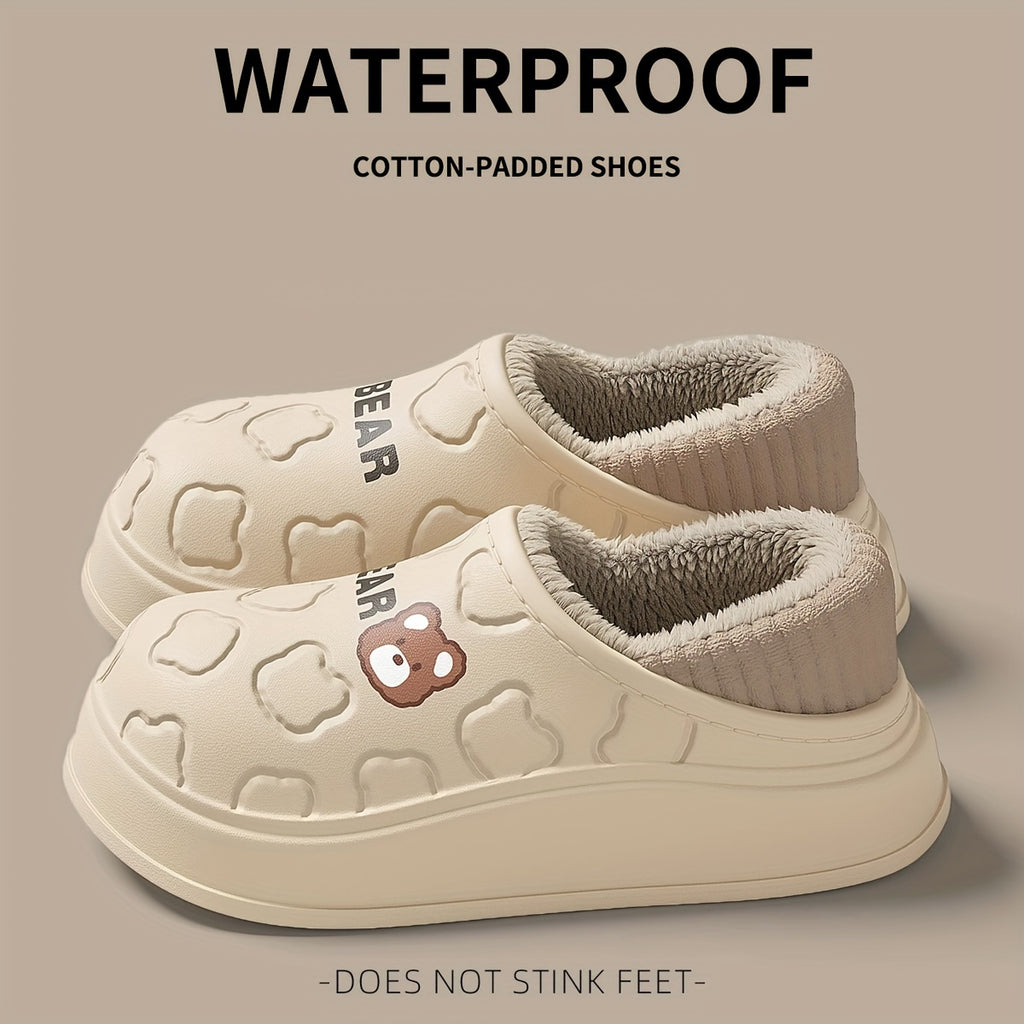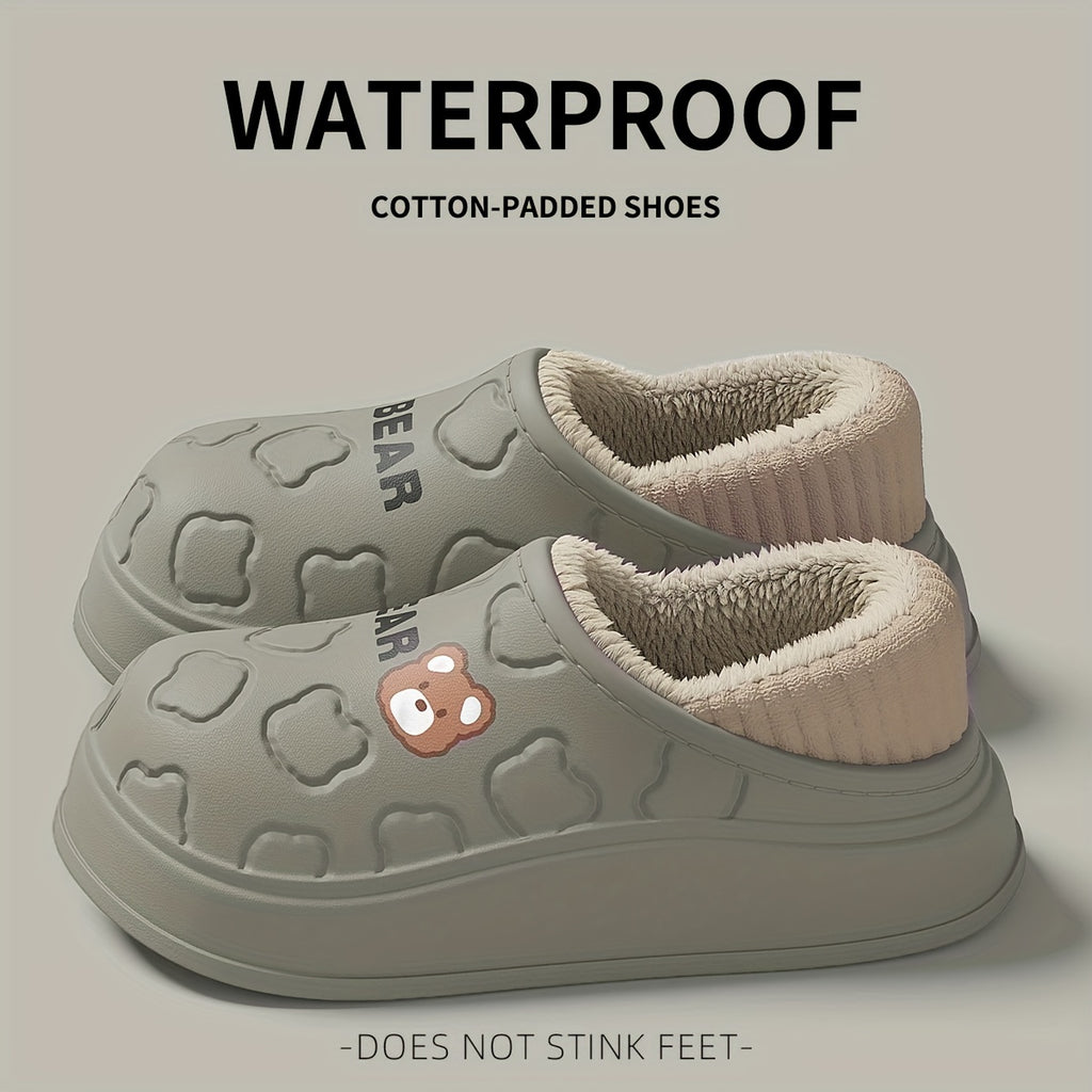 Cute Bear Waterproof Slippers, Cozy & Warm Plush Lined Slip On Shoes, Winter Indoor & Outdoor Slippers