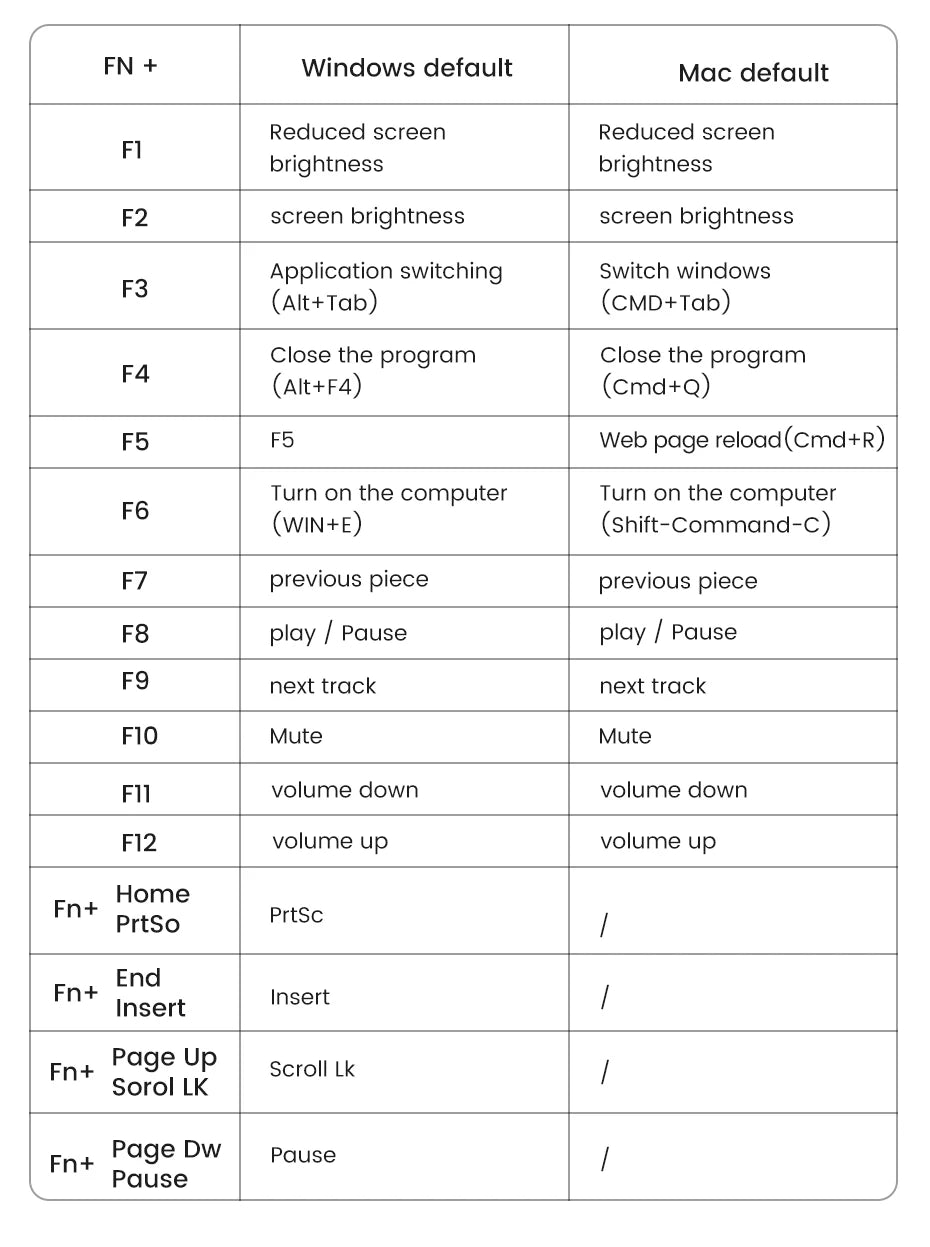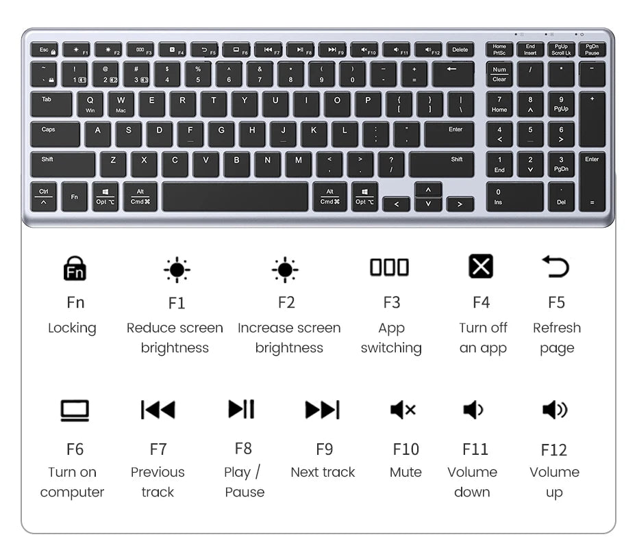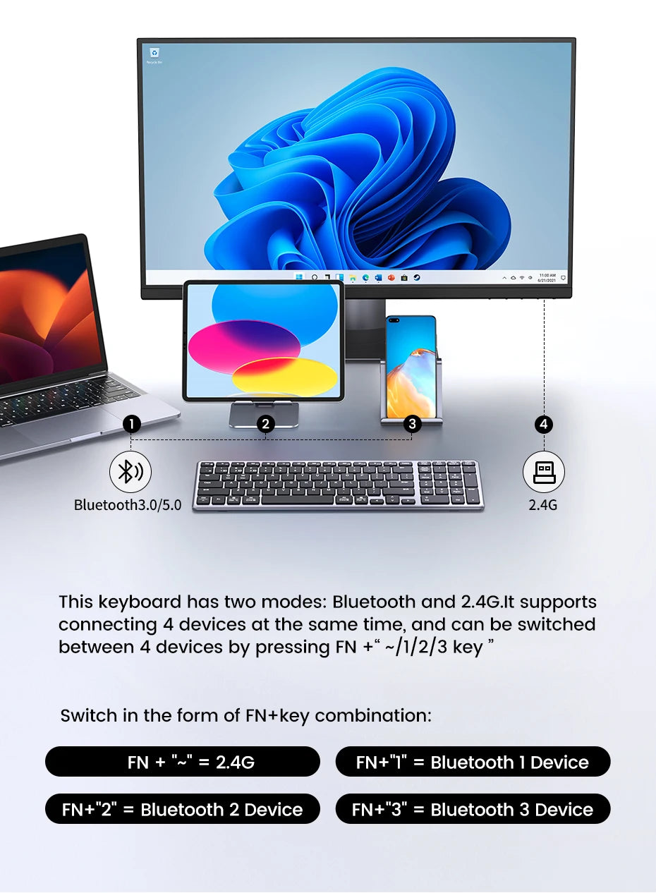 This keyboard has two modes: Bluetooth and 2.4G.It supports connecting 4 devices at the same time, and can be switched between 4 devices by pressing FN +“ ~/1/2/3 key ”: