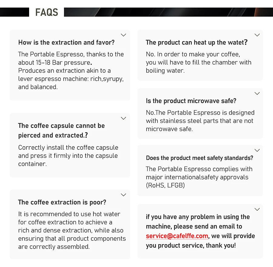 No need for batteries or electricity, manual operation only! With a brewing time of just 1-2 minutes. Portable Espresso Machine is the perfect companion on the go. With the access of hot water, you can enjoy real tasty hand espresso at home, in the office or during hiking, camping and traveling