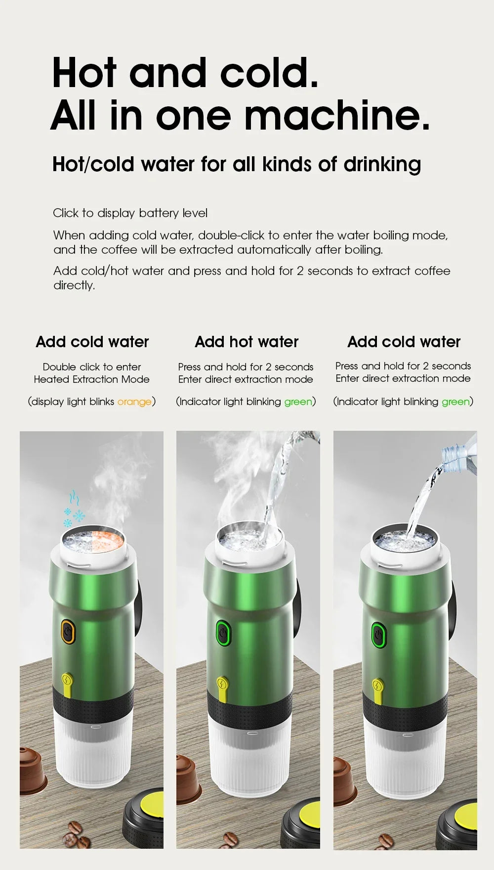 【Intelligent Extraction】Portable espresso machine adopts intelligent heating function, convenient extraction, double-click the power switch, open the heating extraction function, heating extraction. Long press the power switch, directly open the extraction function, convenient operation, suitable for all kinds of hot/cold drinking water.