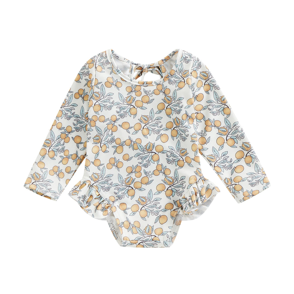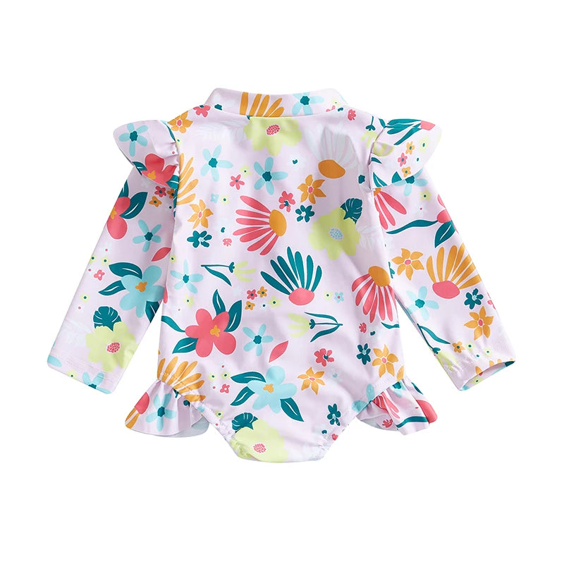 Kids Baby Girl Summer Swimwear Floral Print Backless Ruffles Long Sleeve Bodysuit Bathing Suit Girls Beachwear 0-4 Years
