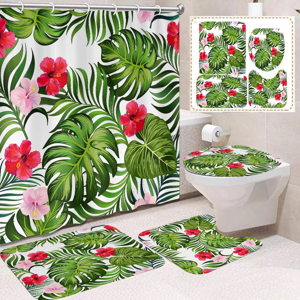 Scene: Bathroom curtain set,Bathroom mats,Bathroom Foot Mats,Toilet Lid Cover,Bathroom curtain
