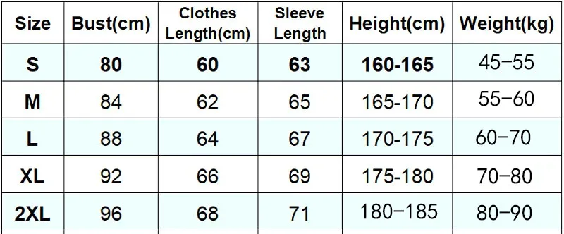 Size S: suitable for men with height 160cm-165cm, weight 45-55kg;