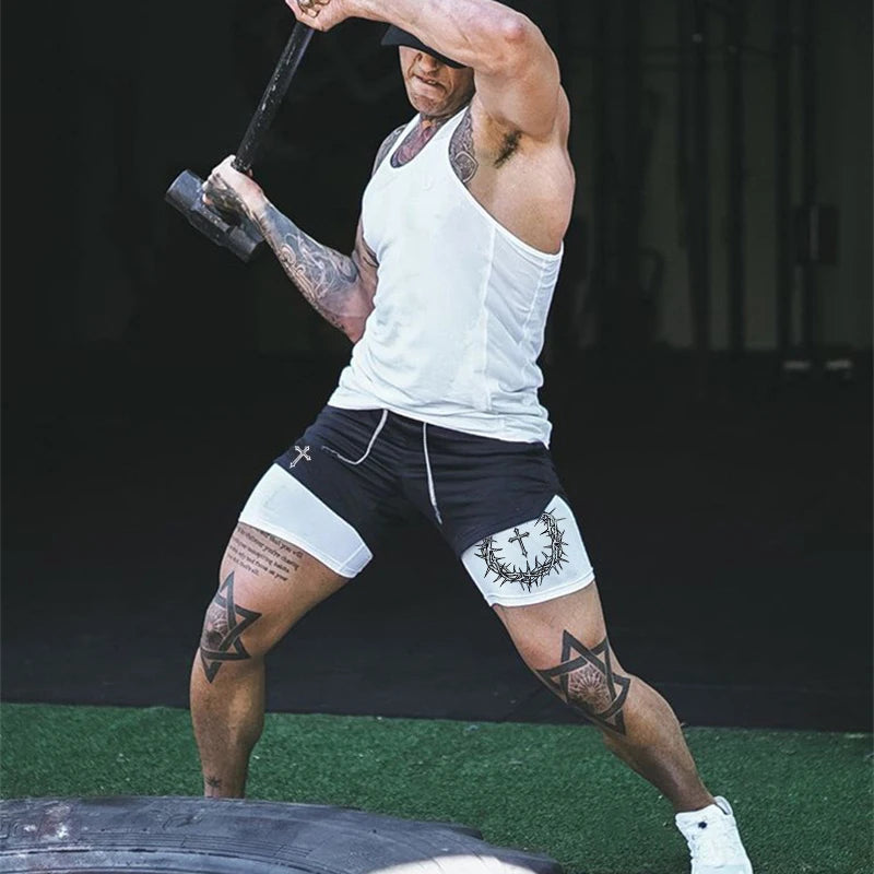 Cross Print 2 in 1 Workout Running Shorts for Men Christian Gym Performance Shorts with Phone Pocket Towel Loop Athletic Outfits