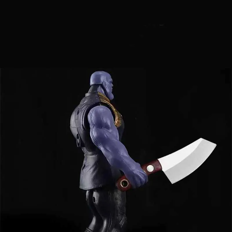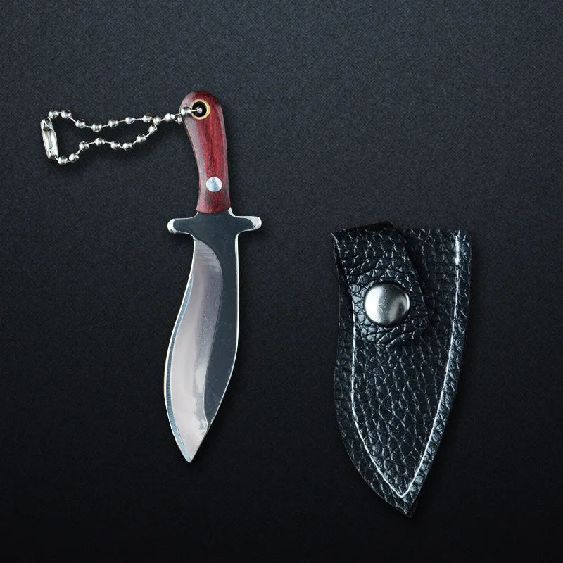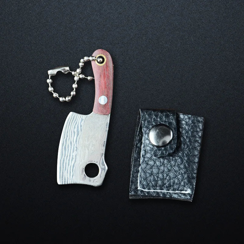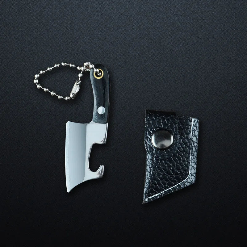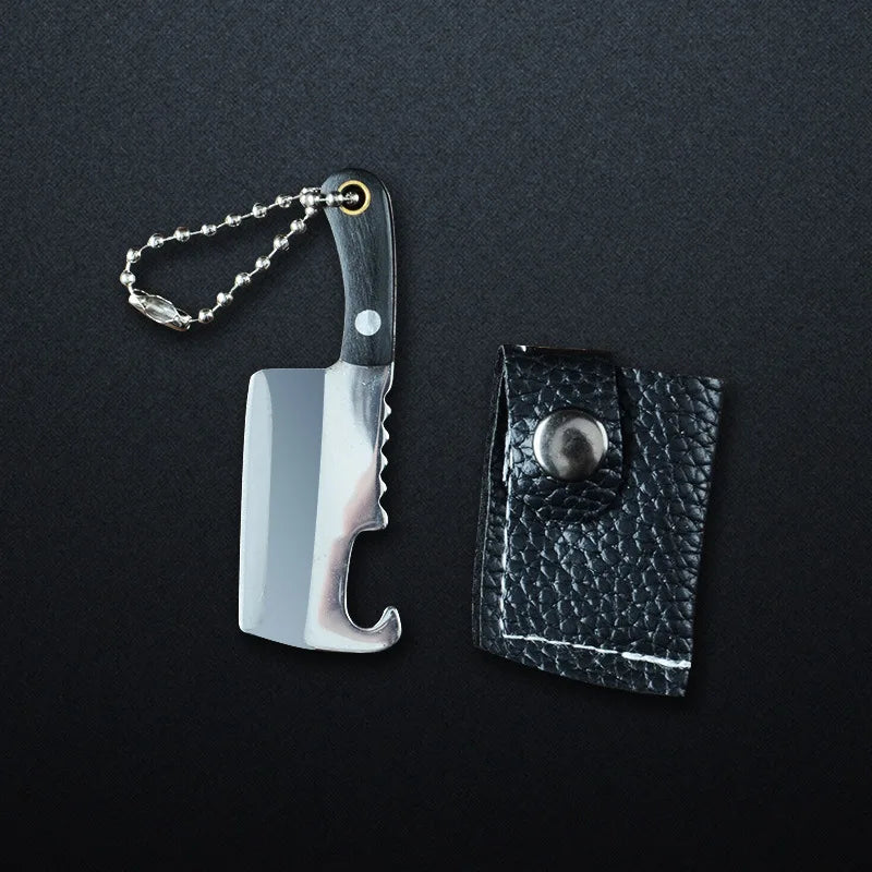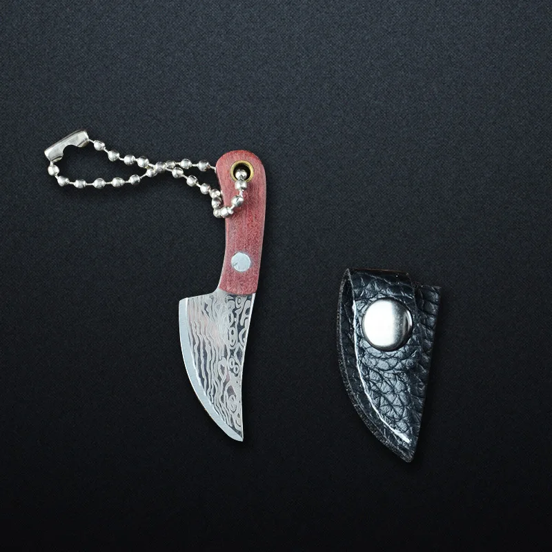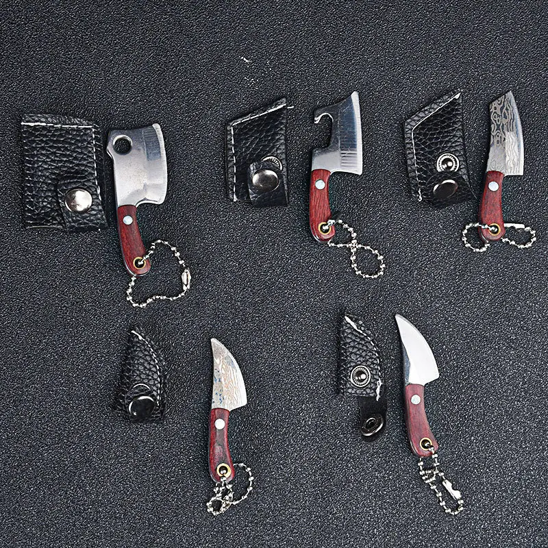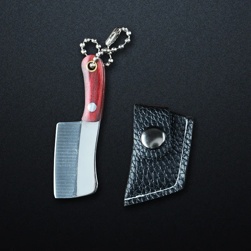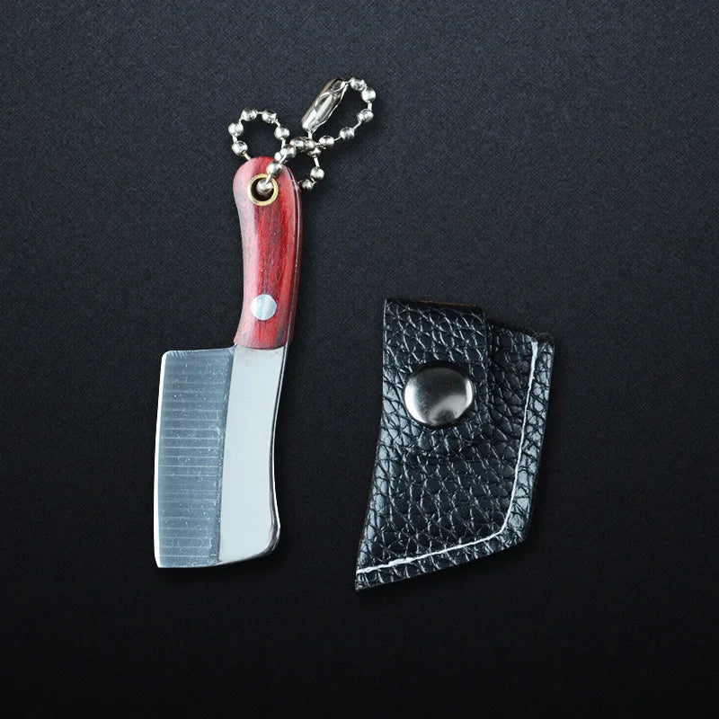 Hay una variedad de mini cuchillos de juguete de chef en diferentes formas, cada uno con una funda protectora negra, sujetos con un gancho y una cadena para guardarlos fácilmente y que se pueden quitar de su llavero cuando está fuera de casa.