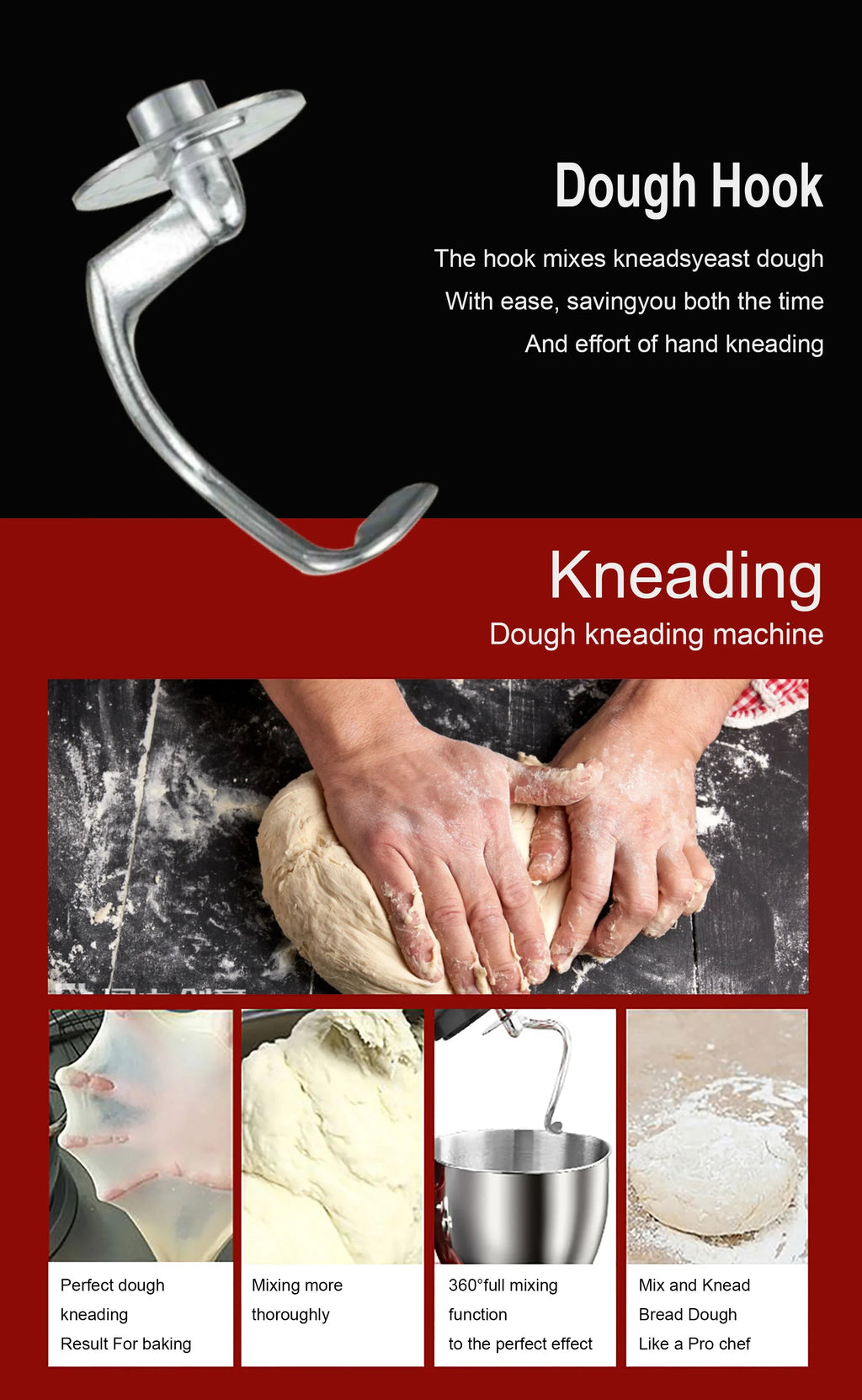 Low noise and overheat protection: Uses aerodynamic theory to reduce resonance in the inner cavity of the cooking mixer, high-quality bearing components, and less than 60 dB. Overheat protection ensures a longer life for the dough mixer.