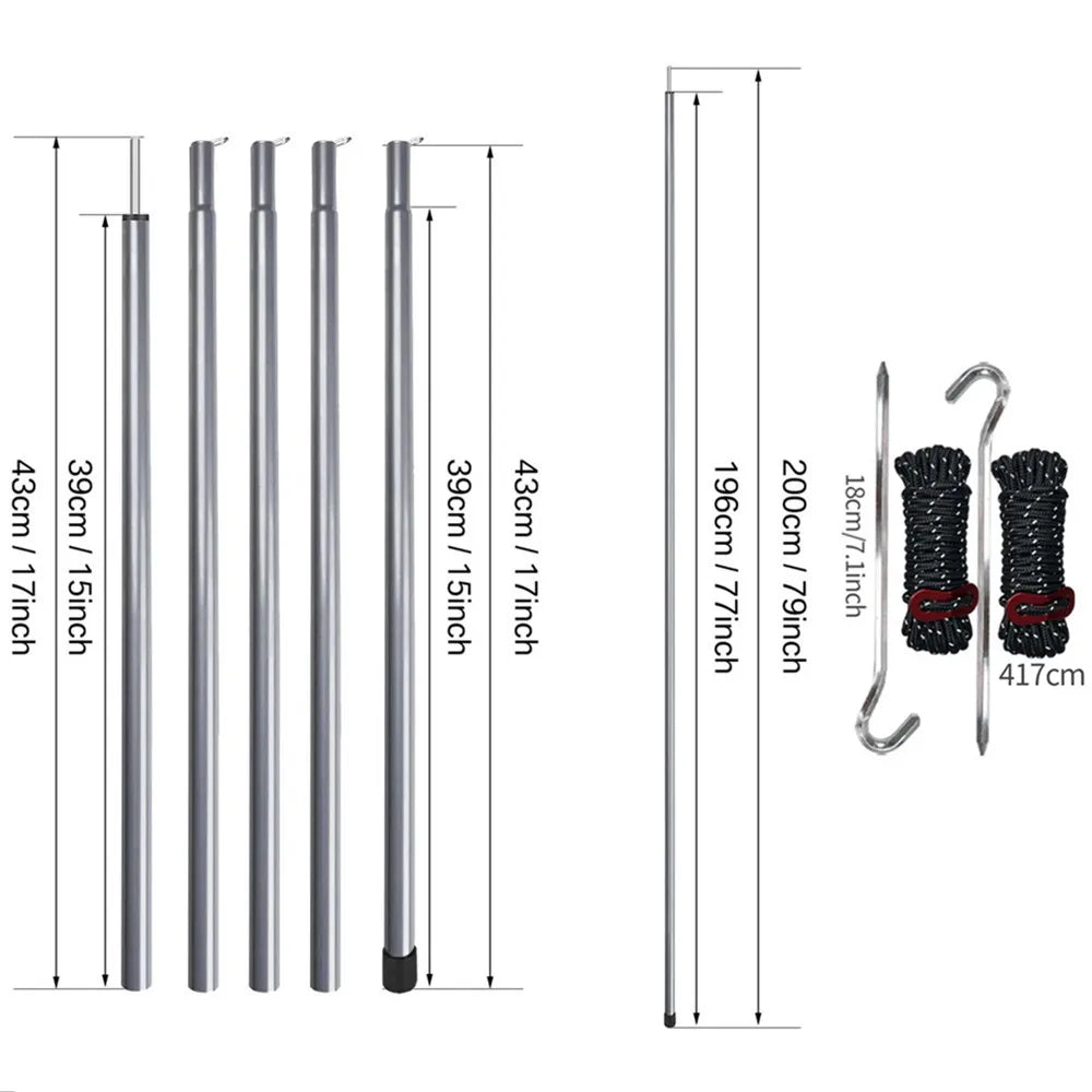 Los postes se pueden usar como postes de parche para la altura de la cabeza de una tienda de campaña, postes de lona, postes de toldos para automóviles, postes de refugios de playa, postes de sombrillas, postes de toldos, adecuados para acampar al aire libre, césped ancho, playas costeras, etc.