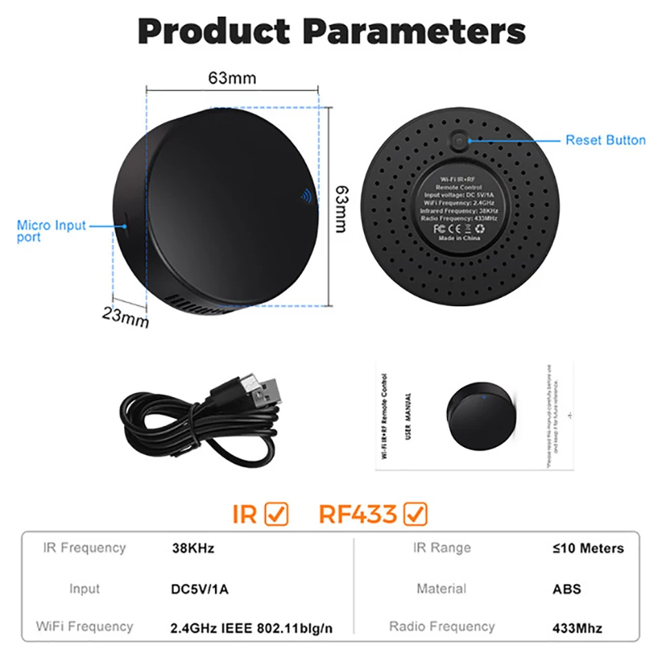 Con este control remoto universal IR, puede usar su smartphone para controlar electrodomésticos como televisores, aires acondicionados, ventiladores, DVD, etc. Es compatible con la mayoría de las marcas. Para más información, consulte la lista de marcas compatibles en la aplicación. Además, cuenta con función de aprendizaje, que le permite copiar las funciones clave del control remoto original a la aplicación.