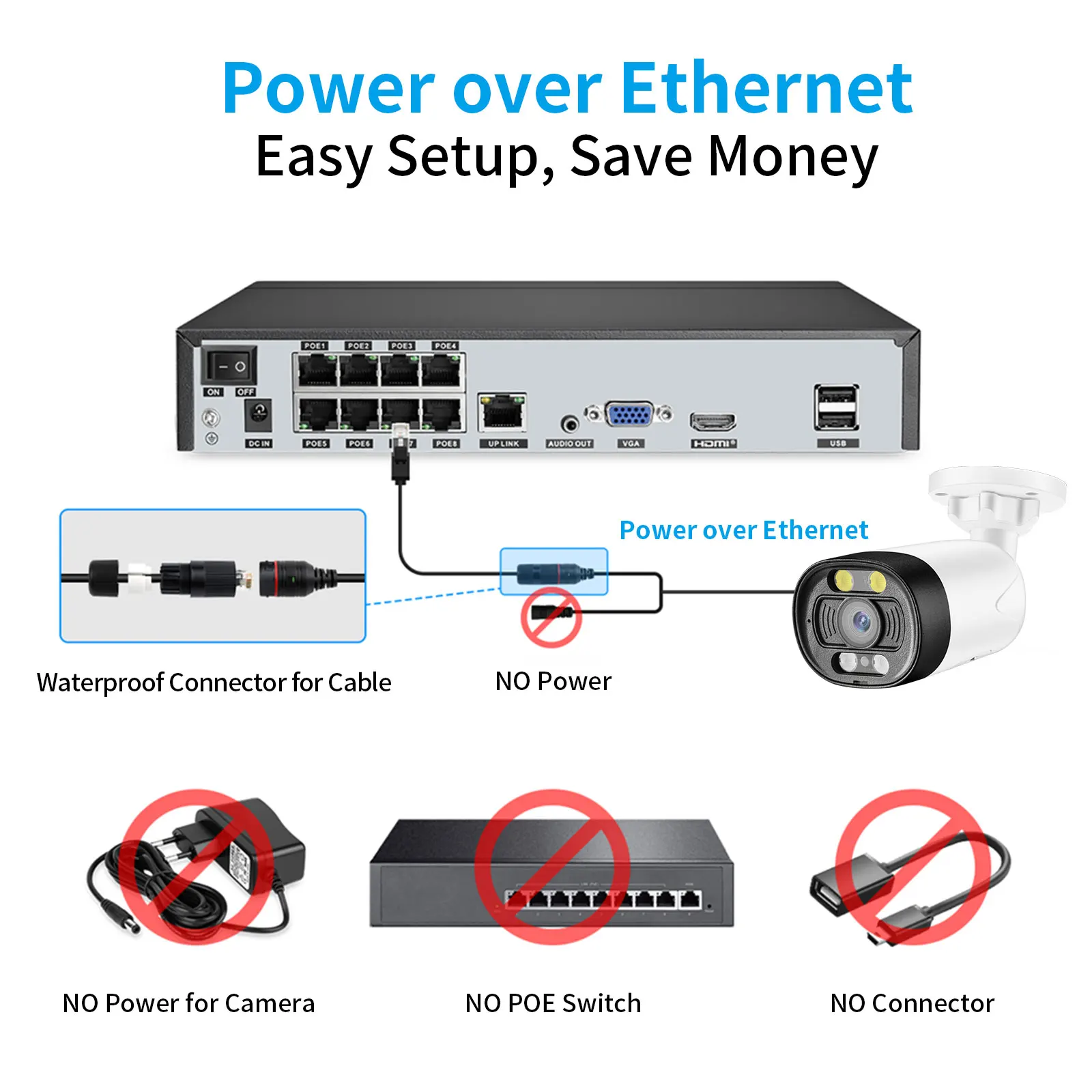 Cámara POE de 48V: Puede conectar un inyector PoE de 48V o un NVR POE de 48V a través de un cable de red de 8 núcleos (no requiere fuente de alimentación),