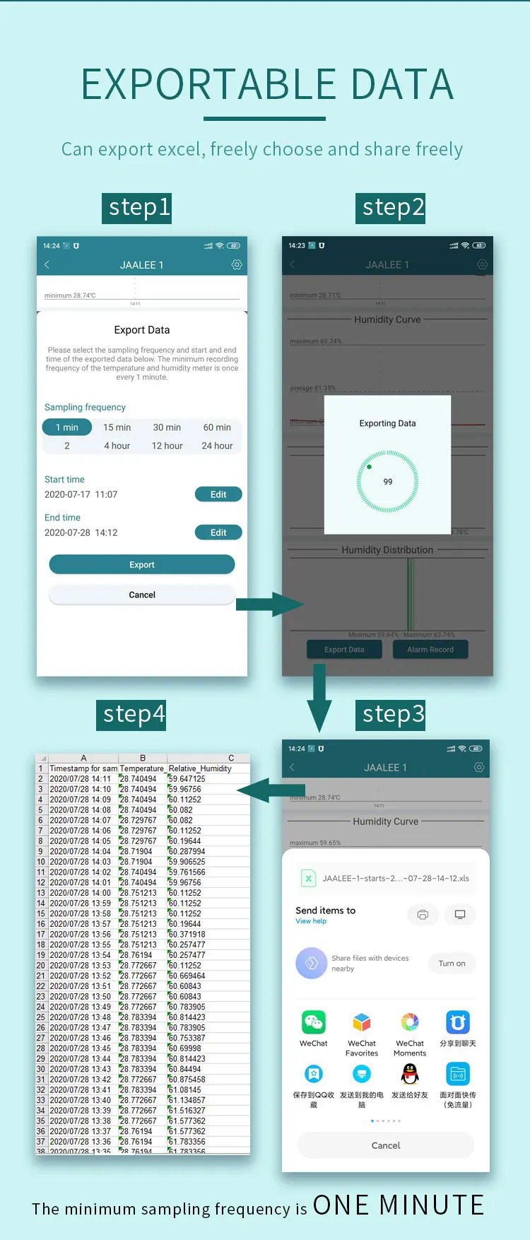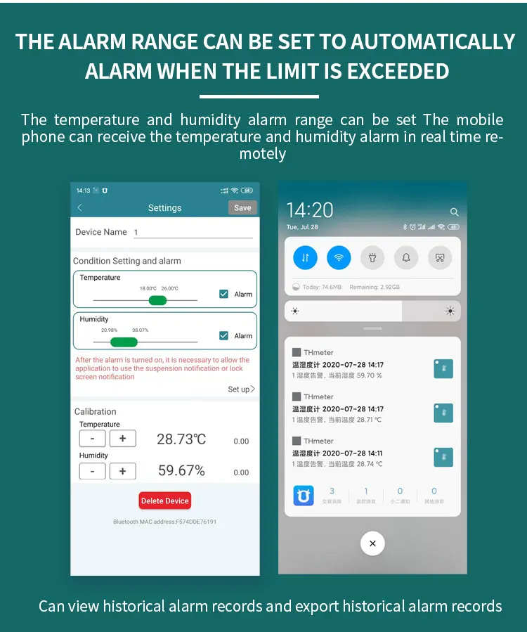1. El higrómetro Bluetooth se puede usar solo. La distancia de acceso es superior a diez metros. Esta distancia se reduce considerablemente en caso de bloqueo. No es necesario usar el teléfono móvil junto con el higrómetro. El higrómetro puede almacenar datos durante 20 días, registrando una vez por minuto. El termómetro y el higrómetro generalmente almacenan datos por sí solos. Tras conectarse al Bluetooth del teléfono móvil, se cargan los datos almacenados en este. Los datos se pueden consultar en el teléfono móvil, exportar a Excel y enviar en formato PDF al ordenador mediante el teléfono móvil (no es necesario mantener el teléfono móvil junto al termómetro en todo momento).