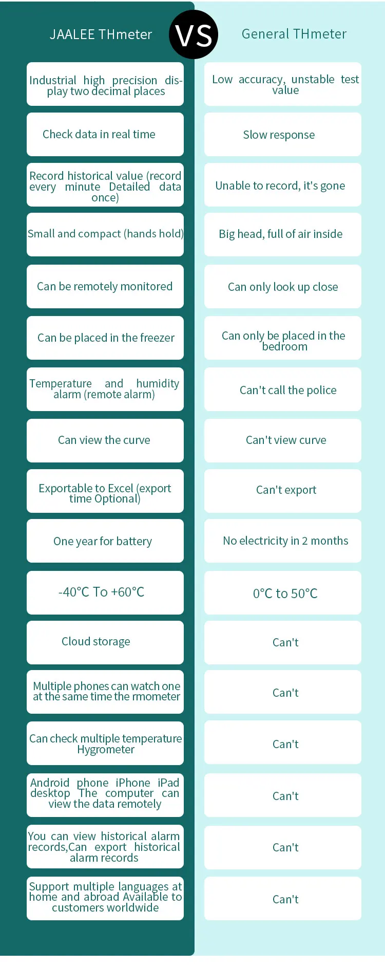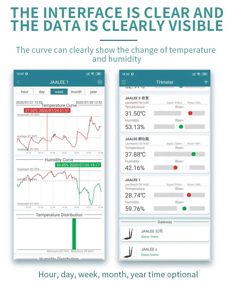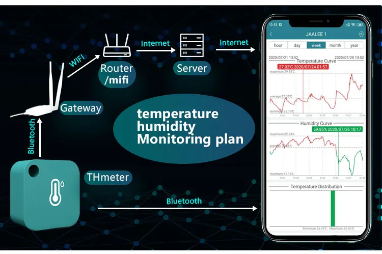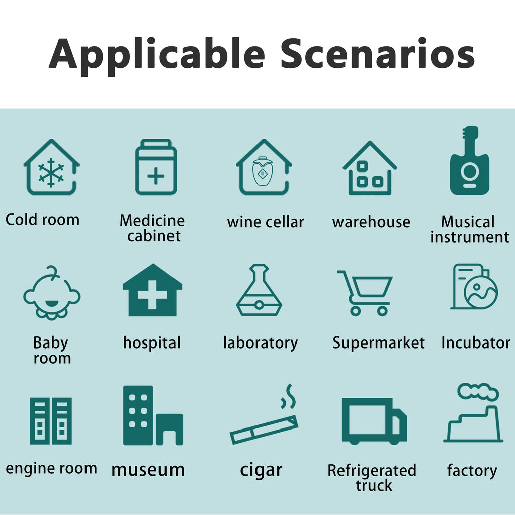 2. Si se combina la red de enlace Bluetooth a Wi-Fi, varios teléfonos móviles y ordenadores pueden consultar la temperatura y la humedad, ver el historial de forma remota y recibir la alarma de temperatura y humedad fuera de rango. Un enlace puede conectar 10 termómetros. Tras conectarse a Wi-Fi, se pueden consultar los datos entre provincias, fronteras y teléfonos móviles.