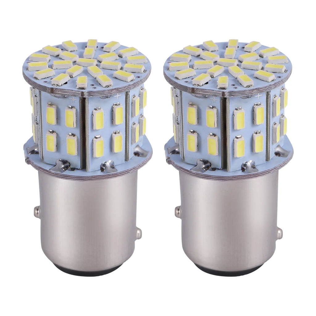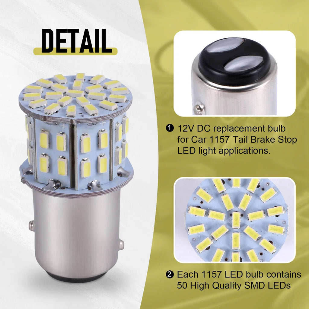 Cada bombilla LED 1157 contiene 50 hermosos SMD de alta calidad, que son mucho más brillantes que la bombilla de repuesto tradicional amarillenta de 12 V CC para aplicaciones de luz LED de freno trasero 1157 para automóvil. LED de alto rendimiento, larga vida útil, iluminación y estabilidad superiores. Nuestra bombilla de repuesto adecuada para luz de freno trasero. La mayoría de las aplicaciones de vehículos requieren 2 bombillas. Vida útil: aproximadamente 50,000 horas Fácil instalación, solo conéctelo y listo, reemplaza sus bombillas directamente. Flujo luminoso: aproximadamente 250-350LM; ¡200% más brillante que el 22 SMD normal! Especificación: 1. Para 12 voltios 2. Número de bombillas: 4 PCS 3. Color del LED: Blanco puro (6000K) 4. Tipo de LED: 3528 3 chips SMD, cada LED tiene 50 SMD en total. 5. Diámetro de la cabeza: 18 mm 6. Altura total: 33 mm 7. Referencia: 1157 (BAY15D) 1157A 7528 2357 2357A 2057A 20573496 1016 1034 1142 1152 1154 1158 1178A 1196 2057A 2357A 2357NA P21/5W (solo como referencia) 8. Aplicación: Excelentes reemplazos para la luz de freno trasera 1157, luz de freno, luz de estacionamiento, luz de posición lateral, etc. Nota: Asegúrese de que este sea el tipo de aplicación de bombilla correcto antes de realizar el pedido. Las marcas europeas de automóviles pueden necesitar tocar las resistencias de carga (MARCAR AQUÍ) para eliminar el código de error en el tablero cuando lo use como luz de señal de giro. Si no se encienden después de insertarlas en el zócalo, para la seguridad de los ojos, no mire directamente a la bombilla a menos de un metro. Color: plata. Material: aluminio. Contenido del paquete: 2 * Bombilla. Solo el contenido del paquete anterior, otros productos no están incluidos. Nota: La luz y las diferentes pantallas pueden hacer que el color del artículo en la imagen sea un poco diferente del real. El error de medición permitido es de +/- 1-3 cm.