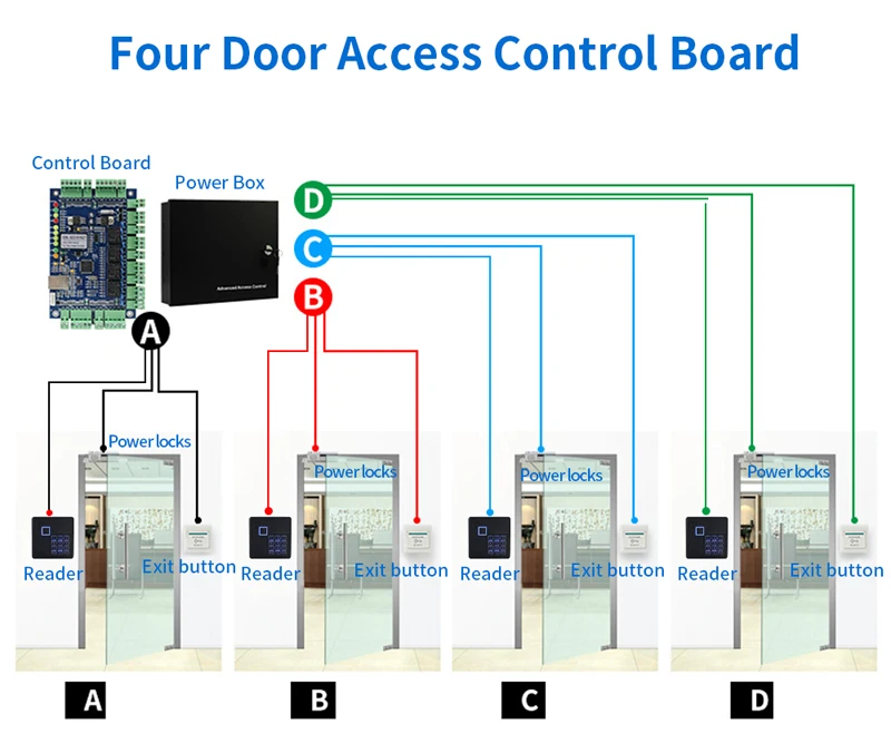 Controla 4 puertas, entra por la puerta deslizando la tarjeta y sal por la puerta presionando el botón. |