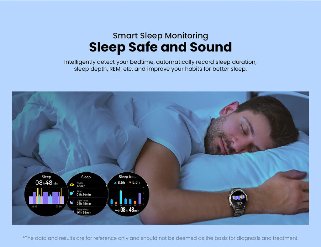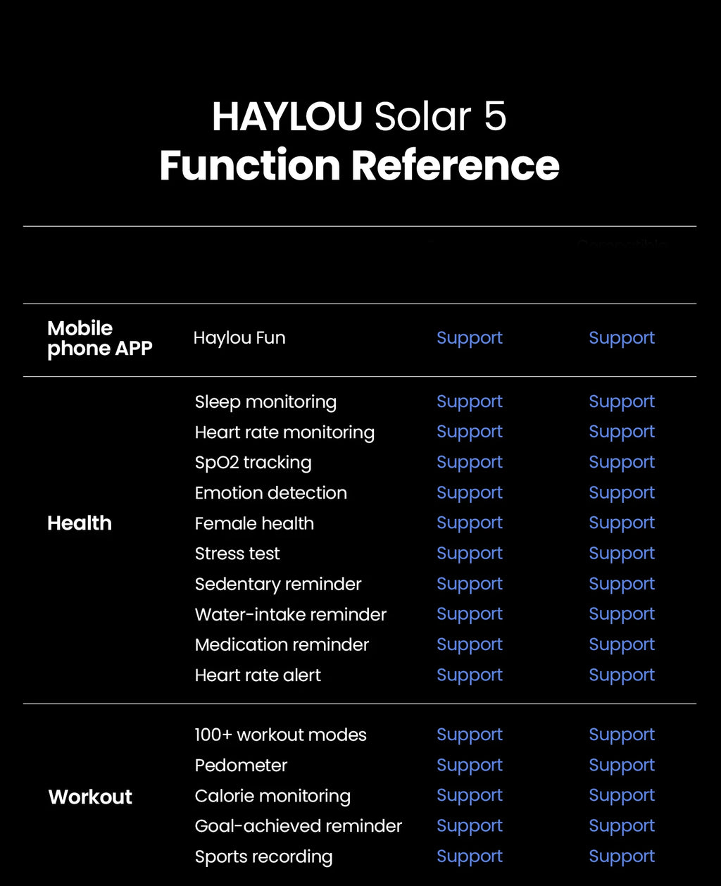 Sleep Monitoring / Heart Rate Monitoring / SpO2 Tracking / Female Menstrual Cycle / Stress Test / Sedentary Reminder / Water-intake Reminder / Medication Reminder / Hoart Rate Alort / Breathing Training / Motion Detection.
