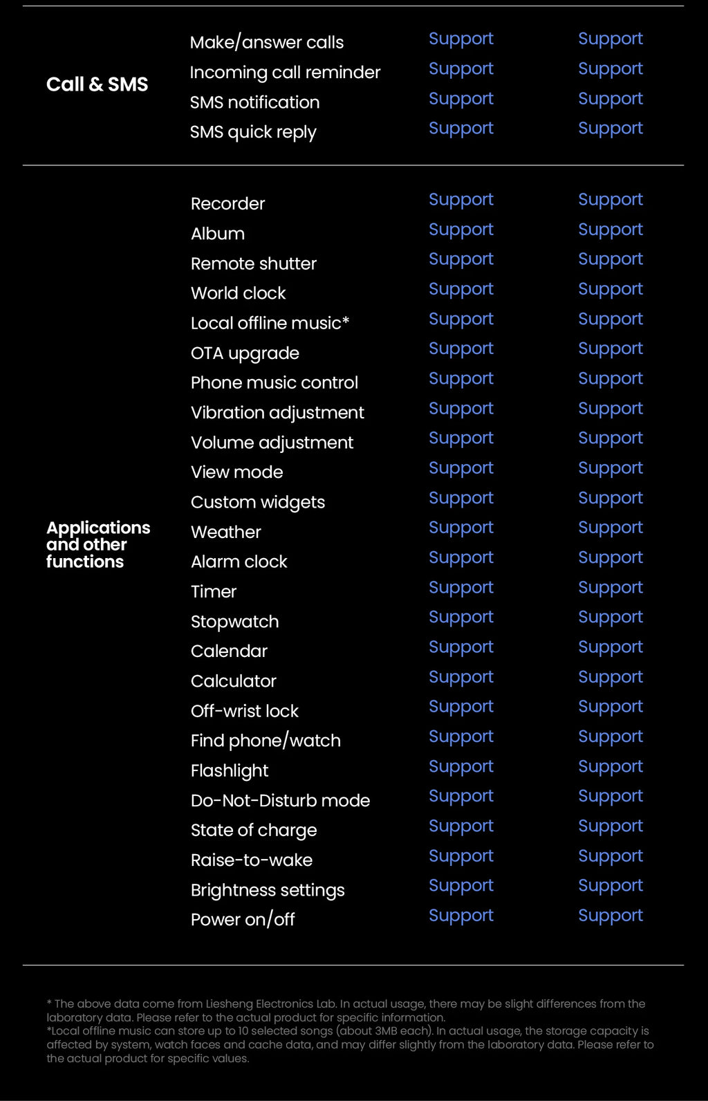 OTA upgrade / Music control / Vibration adjustment / Volume adjustment / View mode / Remote shutter / Built-in watch faces / 150+ online watch faces / Custom widgets / Weather / Alarm clock / Timer / Stopwatch / Calendar / Calculator / Find phone / Flashlight / Do-Not-Disturb mode / State of charge / Raise-to-wake / Brightness settings / Power on/off / Album storage function / Local music / Recording function / Support NFC / Remote shutter / Sync with Strava