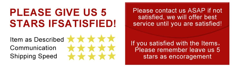 1. Please leave 5 star feedback if you're satisfied with our products and service, we will appreciate it (Item as Described 5 stars, Communication 5 stars, Shipping time 5-stars)2.If you have some unsatisfactory problems after receiving the product, please do not leave a bad review immediately, please leave a message to tell us, we believe that as long as there is sincerity, any problem can be negotiated. Your satisfication is our motion to do better.thank you very much