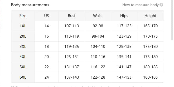 size_info: {"sizeInfoList":[{"length":{"cm":"118","inch":"46.46"},"size":"XL","vid":-1},{"length":{"cm":"124","inch":"48.82"},"size":"XXL","vid":-2},{"length":{"cm":"130","inch":"51.18"},"size":"XXXL","vid":-3},{"length":{"cm":"136","inch":"53.54"},"size":"4XL","vid":-4},{"length":{"cm":"142","inch":"55.91"},"size":"5XL","vid":-5},{"length":{"cm":"148","inch":"58.27"},"size":"6XL","vid":-6}]}