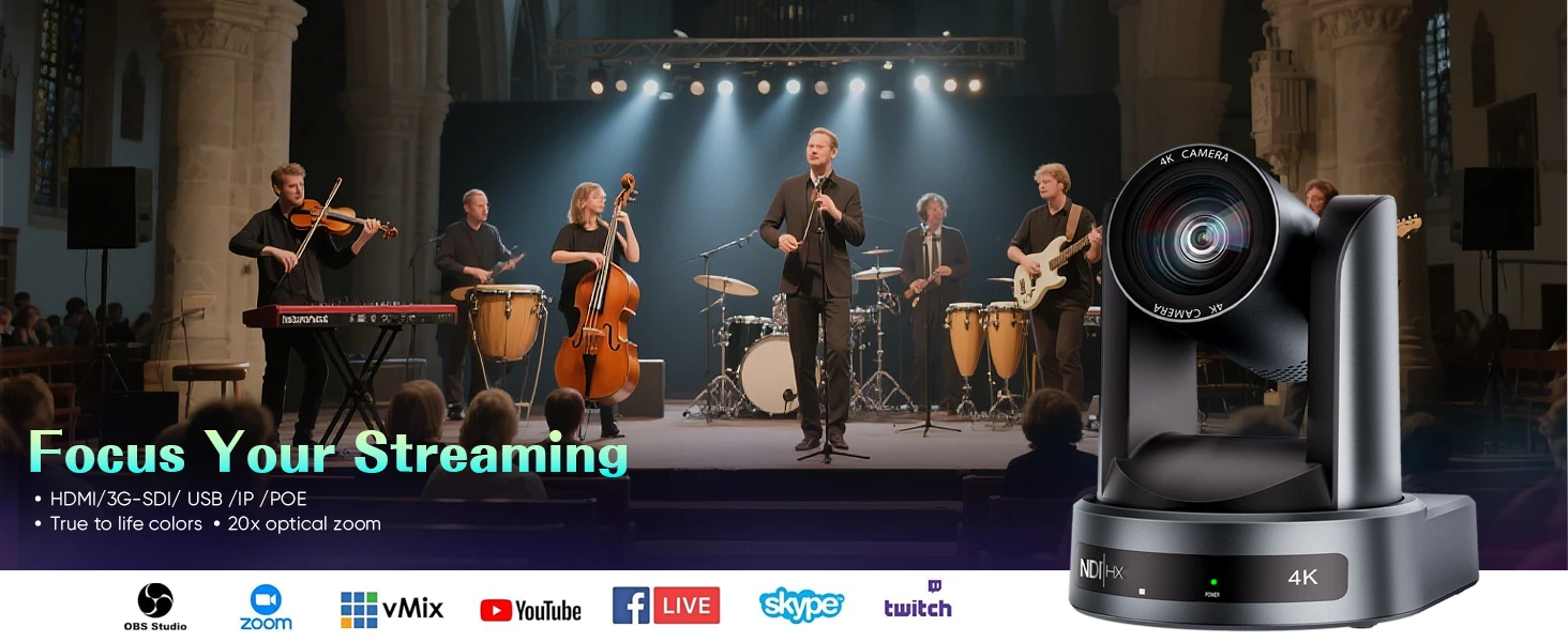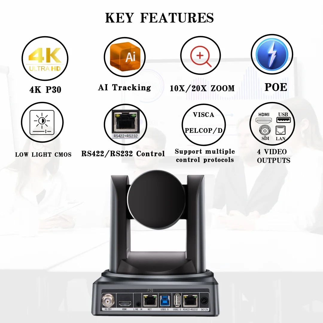 1080P 4K NDI PTZ Camera 10X 20X Zoom IP Live Streaming HDMI SDI USB POE Conference Camera for Church Meeting Broadcast Youtube