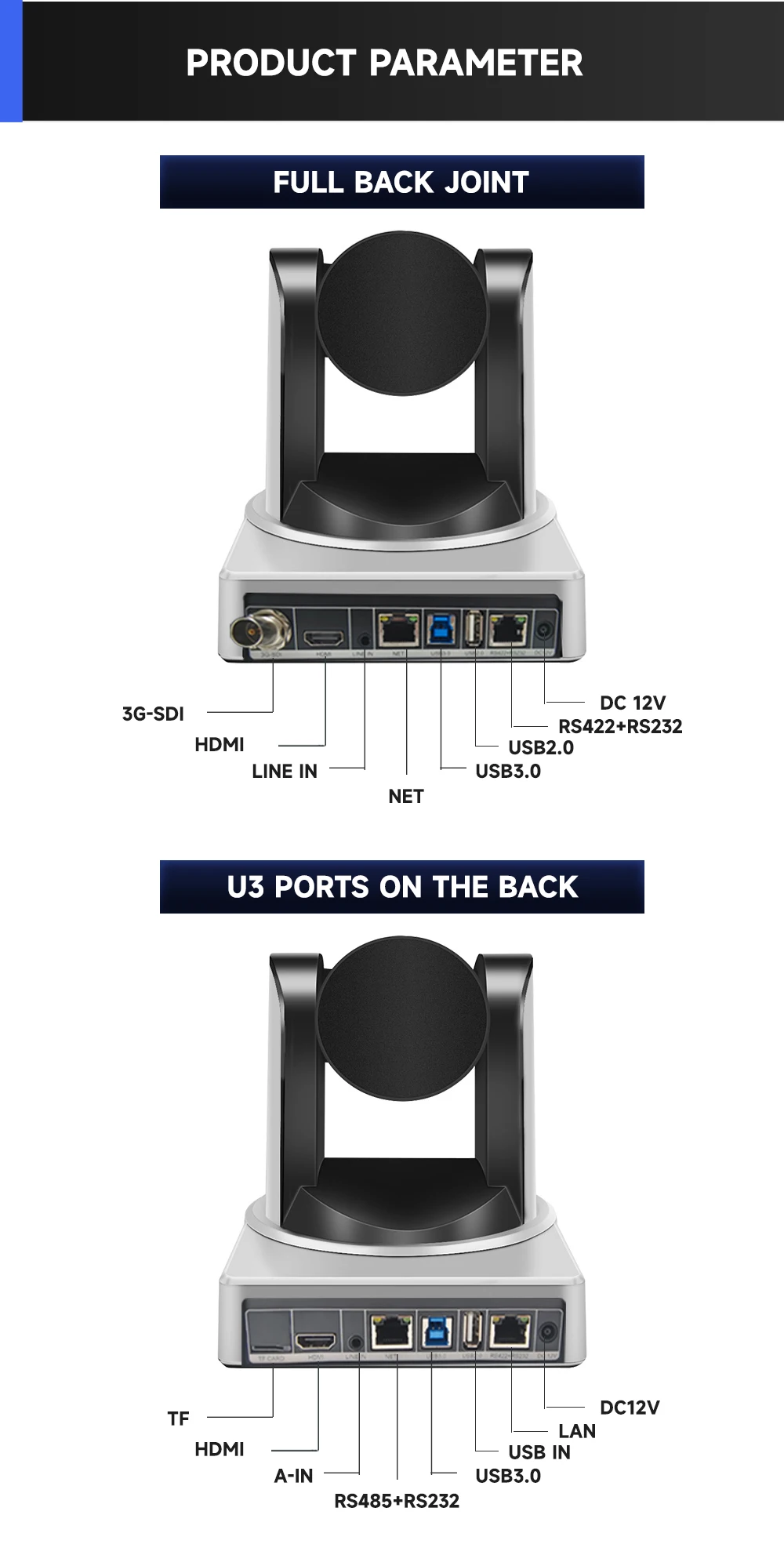 It supports HDMI output, 3G-SDI, USB3.0, and IP interfaces, with an effective transmission distance of up to 150 meters (at a resolution of 1080p). HDMI, SDI, and the network can output simultaneously.