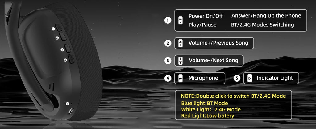The wireless earphones are equipped with a built-in 600 mAh battery. When used at 50% volume, the wireless mode can last up to 50 hours, and the Bluetooth mode can last up to 200 hours, so you don’t need to charge frequently. In addition, it has a power-saving mode: under 2.4G connection, if there is no music playing for 3 minutes, the headset will automatically turn off to save power.