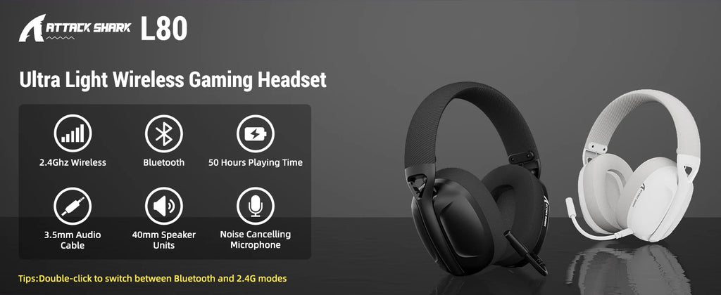 Unlike most single-mode connection headsets, our L80 headsets can meet the three connection methods of wired/Bluetooth/2.4G Wireless. Using advanced lightseed wireless transmission technology, the 2.4G dual-head receiver (regular USB head + type C head) connection delay is as low as about 20ms, high performance and low latency, providing gamers with an immersive experience and a wider range of usage scenarios.(Note:Short press twice in succession to switch Bluetooth/2.4G mode).