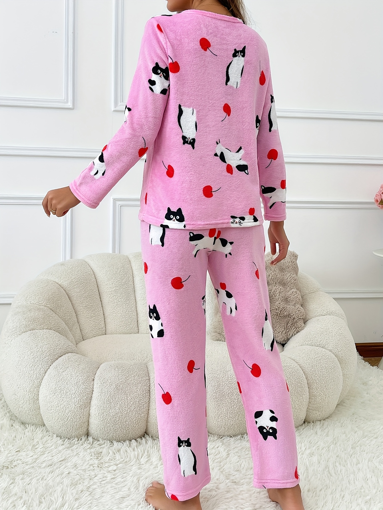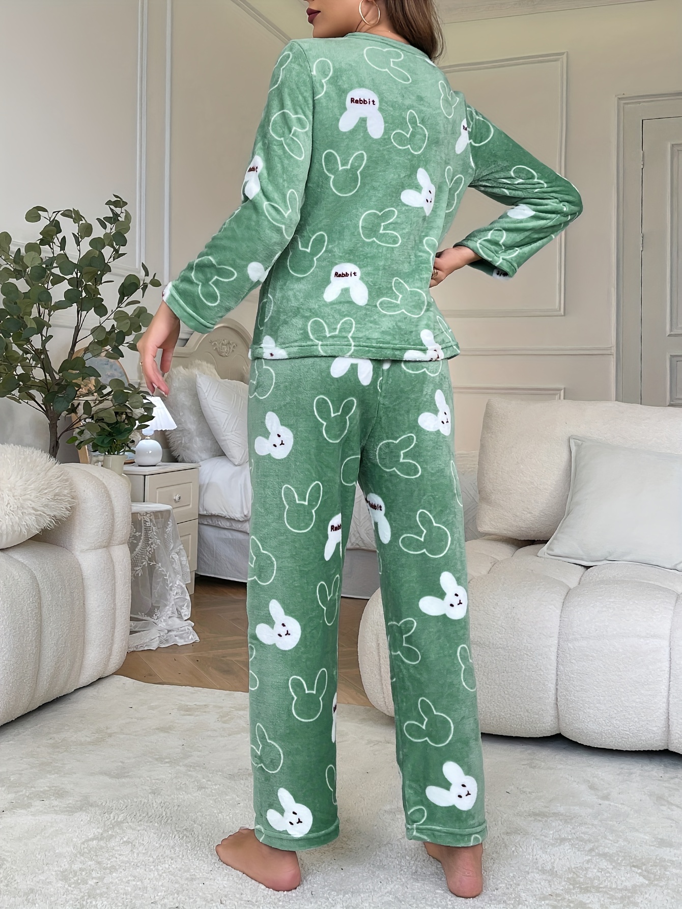 [Home Relaxation] Cozy & Warm Women's Fleece Pajama Set in Green with White Cartoon Rabbit Pattern - Soft Polyester, Anti-Static, Machine Washable - Elegant Home Loungewear with Round Neck Top & Pants for Fall/Winter, Plus Si